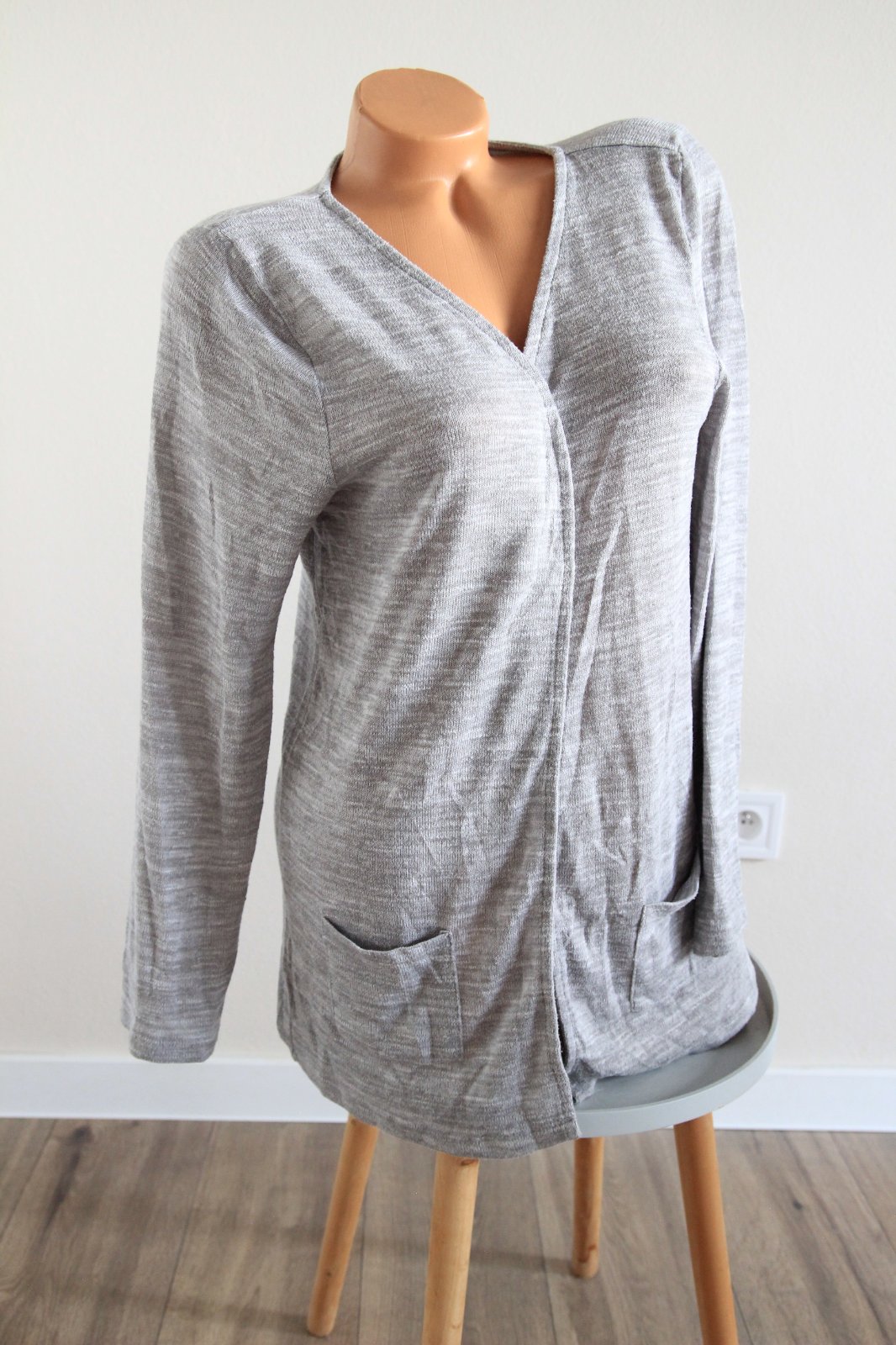 Bledo šedý kardigan s vreckami bez zapínania, tenší materiál. Veľkosť XL. Nosený, pár mini žmolkov.