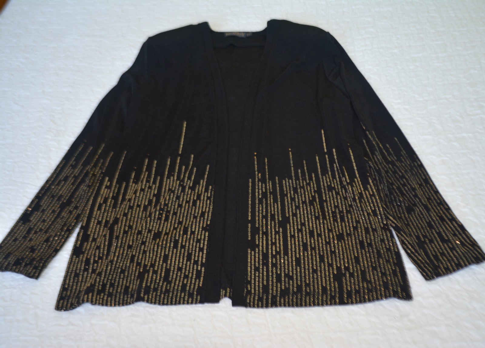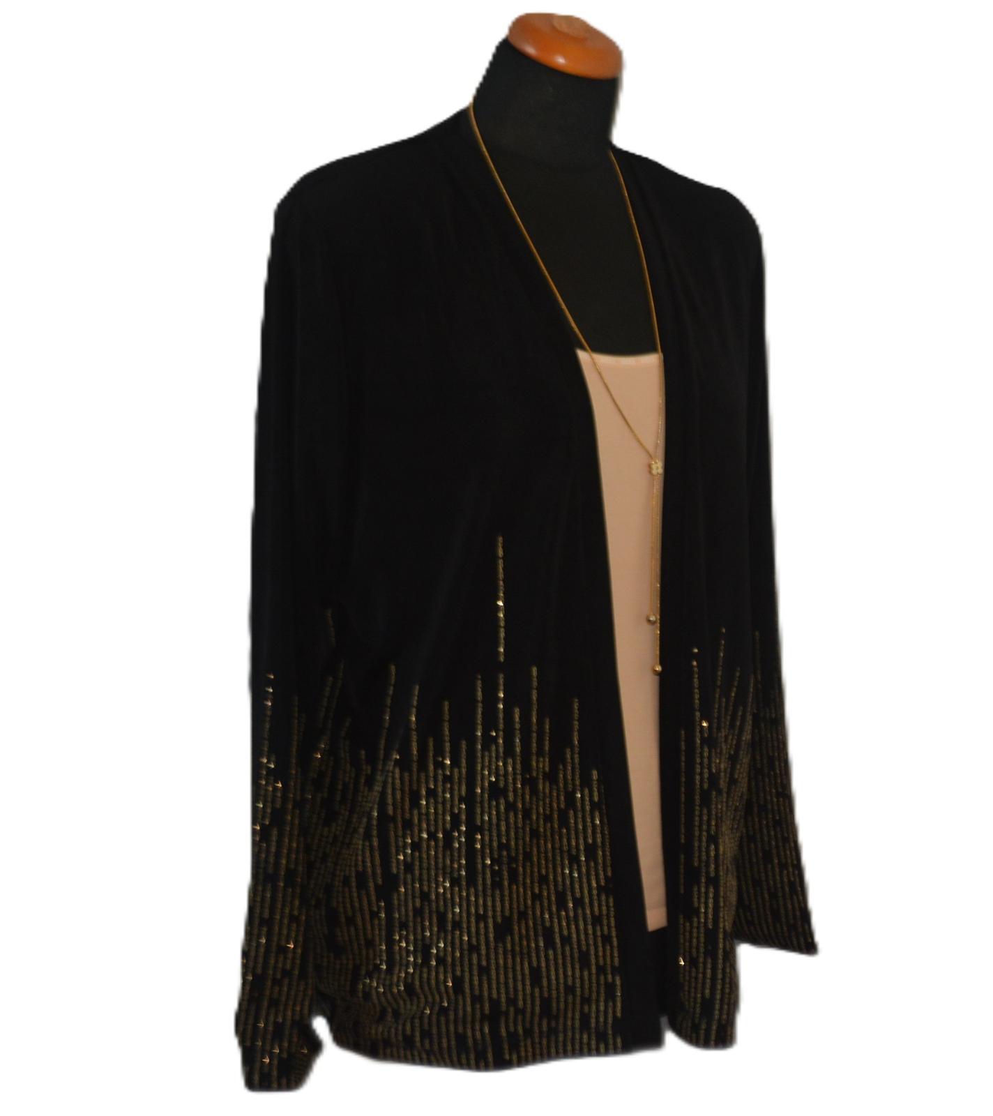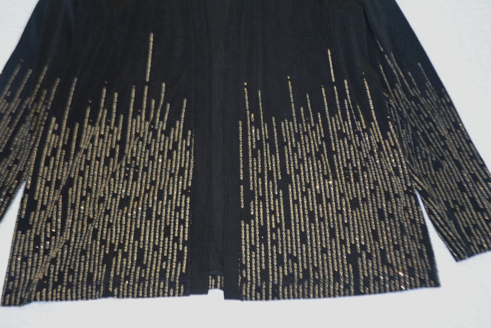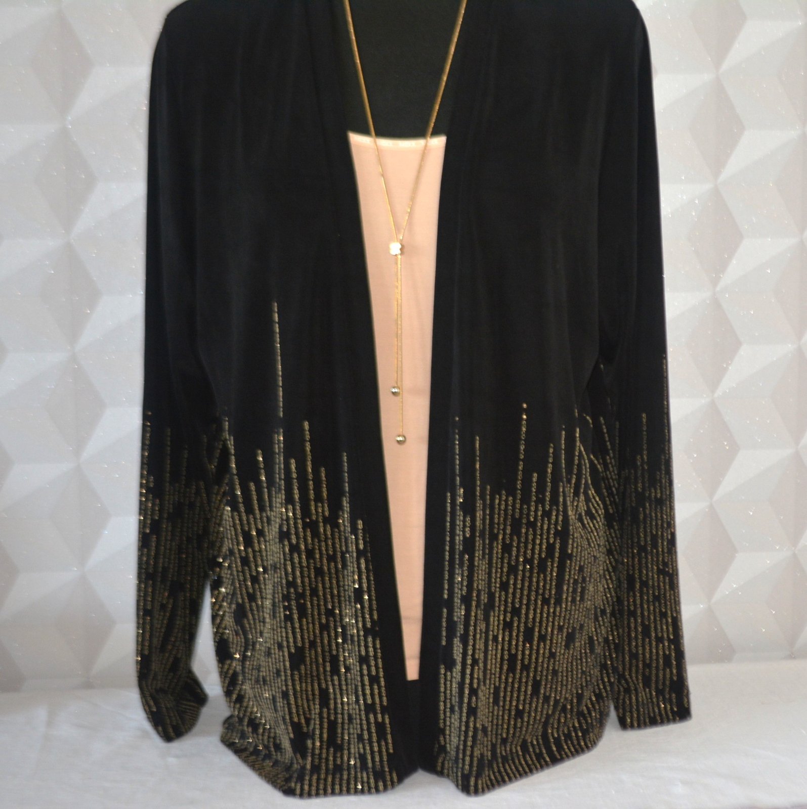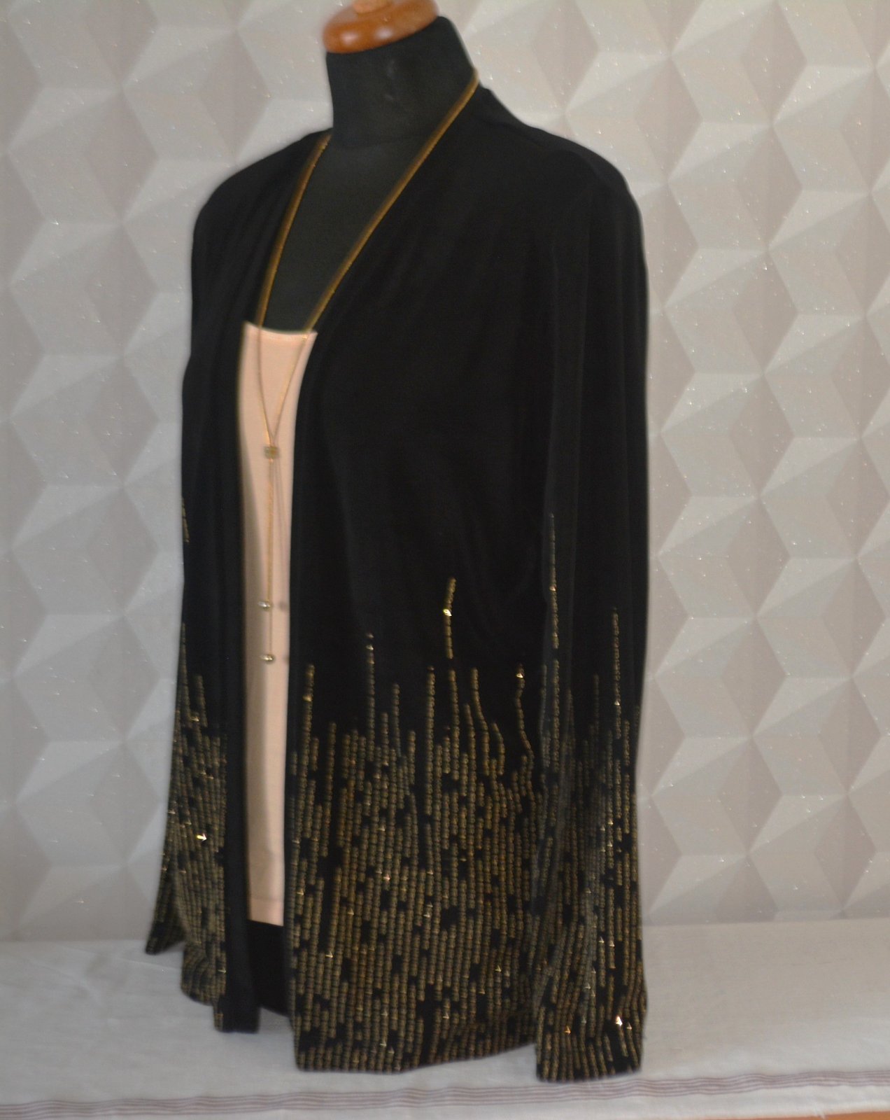 Sveter je čierny so zlatým zdobením, je bez zapínania. Materiál je padavý, nekrčivý.
