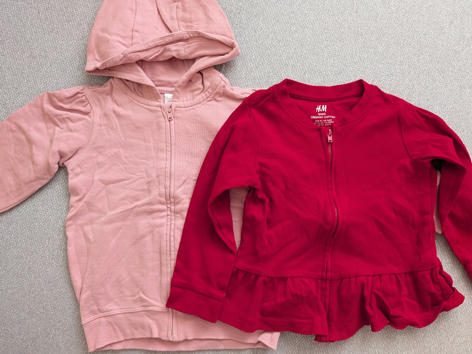 Predám mikinky. Červená s volánikom, tenšia. Ružová s kapucňou. Cena za obe spolu