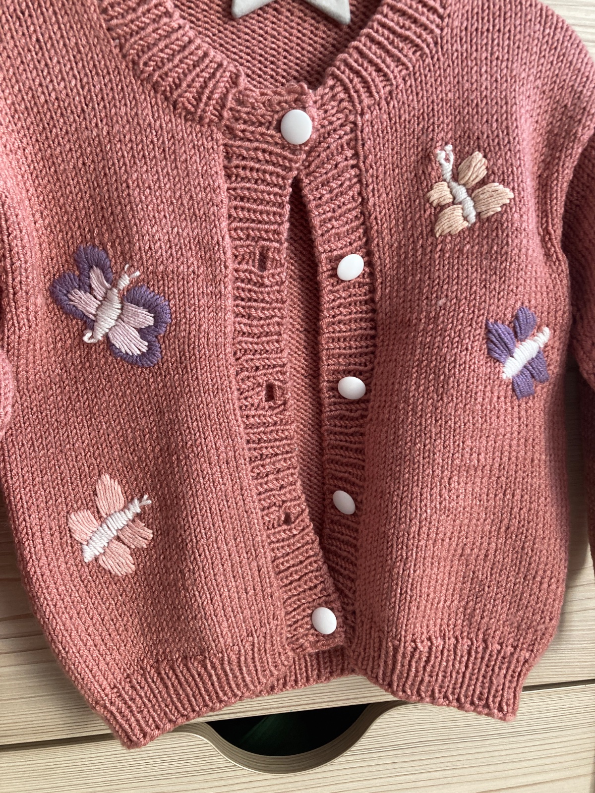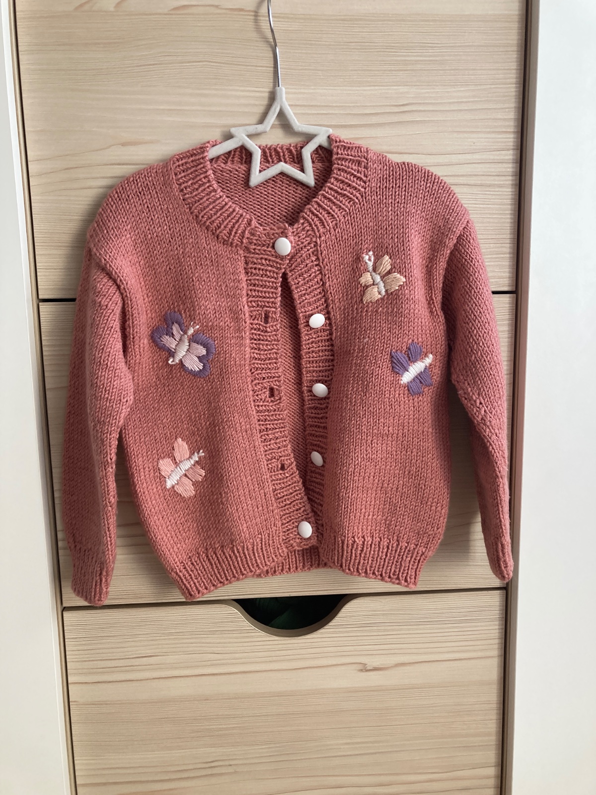 Ponukam na predaj ručne strikovany dievčenský kardigan z Drops Merino Baby vlny. Na hrudi vyšité motyliky. Dcérka ho mala snáď 5x. Ako novy. Veľkostne sedi na 110,116