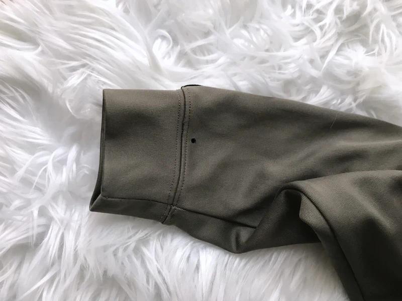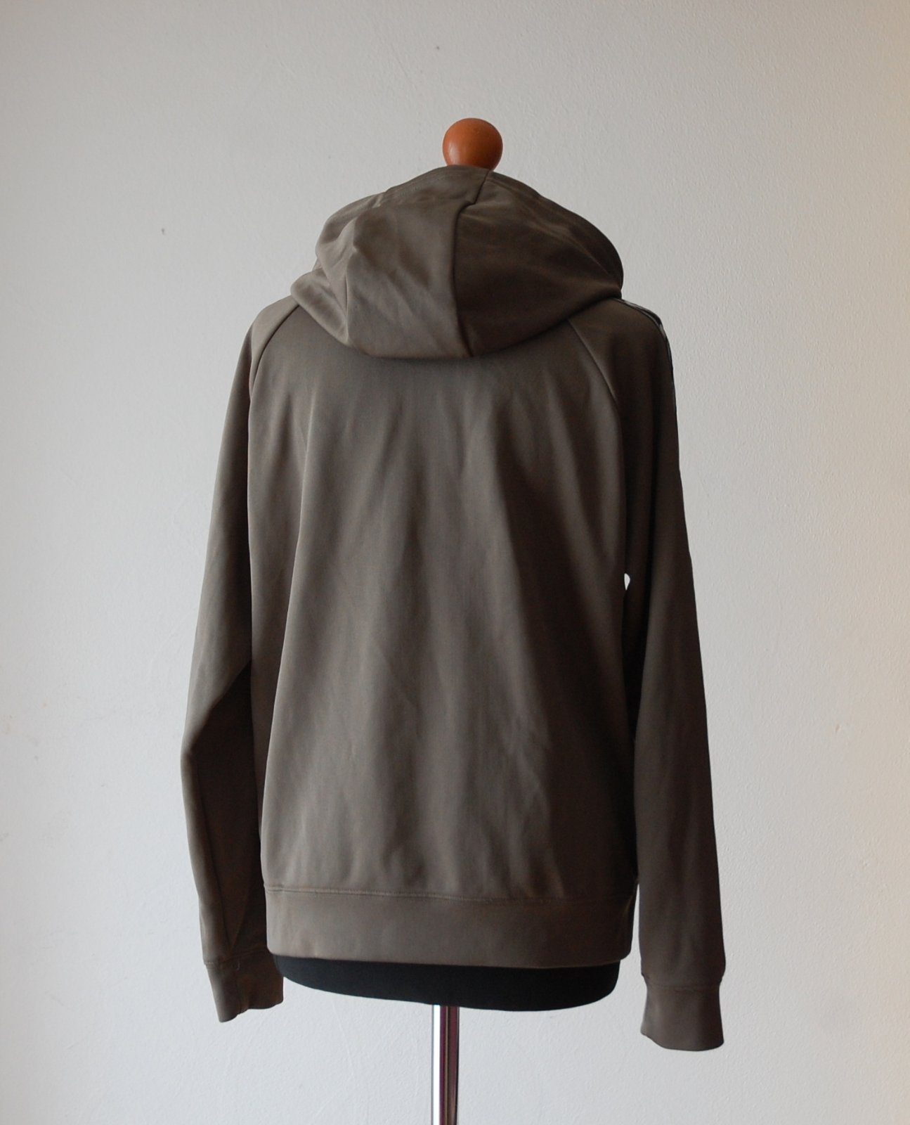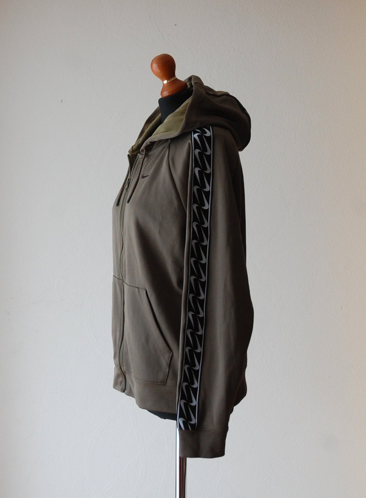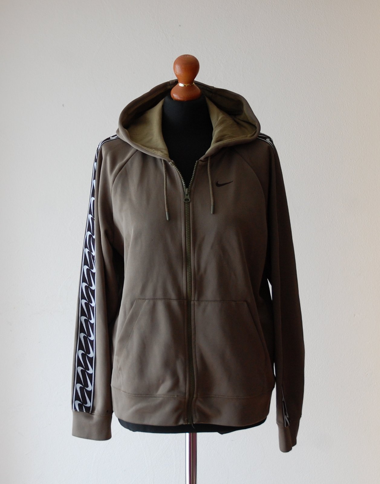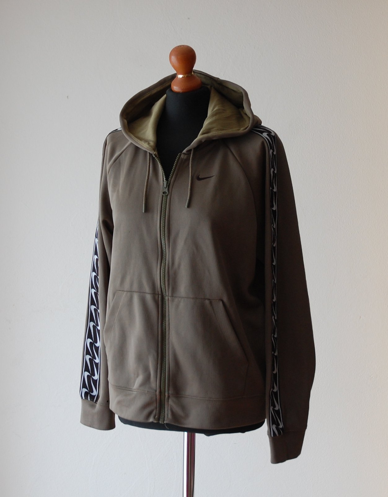 Mikina má olivovo zelenú (army) farbu a je doplnená o charakteristické čierno-biele pásy s logom Nike (swoosh) pozdĺž rukávov. Je vyrobená z príjemného a odolného materiálu, má nastaviteľnú kapucňu a dve predné vrecká. Mikina je nosená a má drobné estetické chyby – na dvoch miestach je prepálená (zohľadnené v cene). Okrem týchto dvoch miest je vo veľmi dobrom stave, farba je sýta a zips plne funkčný. Ideálne na donosenie, na von alebo na voľnočasové aktivity, kde drobné chybičky neprekážajú. Prepálenie je v podpazuší, tam to nie je vidieť a na rukáve to vyrieši nášivka.