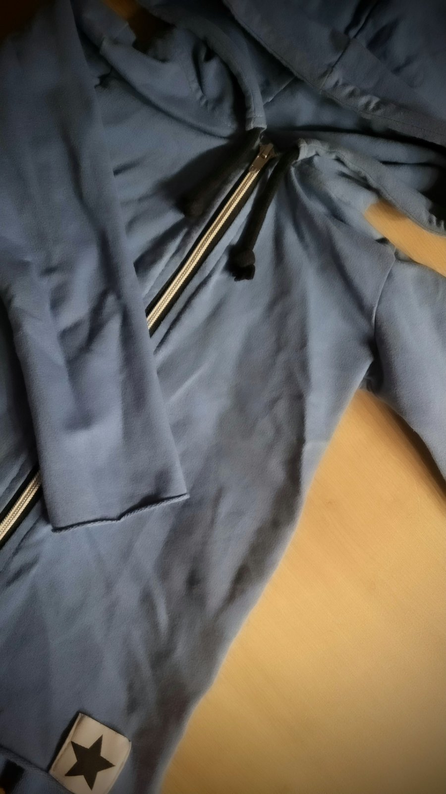 Naozaj krásna mikina s volánikmi na zadnej strane vo veľmi peknom odtieni modrej. Sadne aj ako 116.