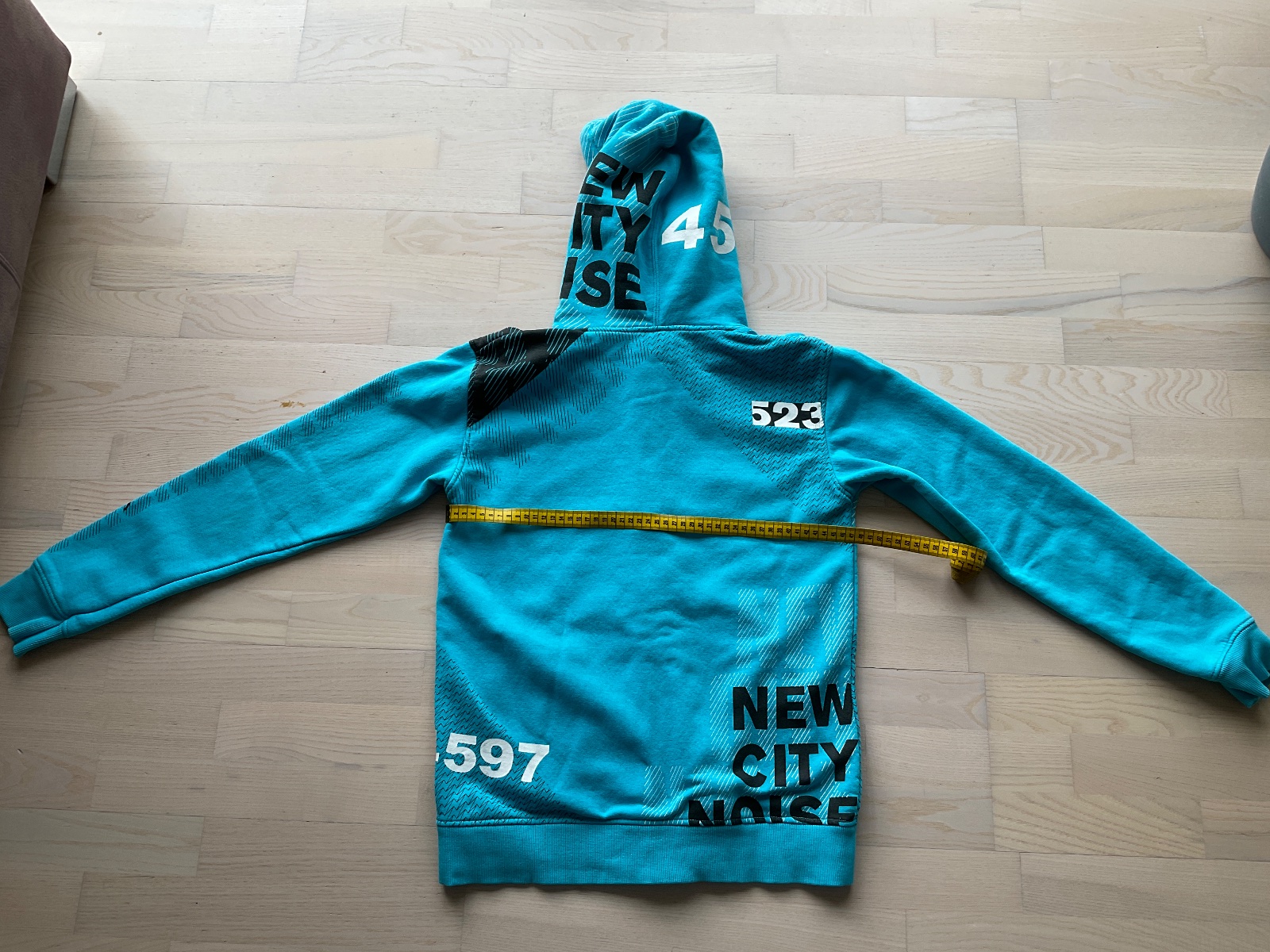 Mikina, bavlna +polyester, teplá, na rukávoch čierna aplikácia. Dĺžka 70 cm, šírka 47 cm, rukávy62 cm