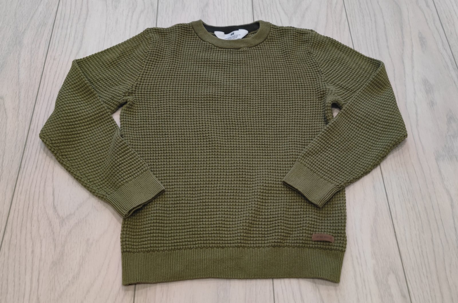 Pulóver zelenej farby s červeným a bledo-hnedým pásom .Má plastický vzor s osmičkami.Je málo nosený po jednom dieťati, material je príjemný,nepichá.