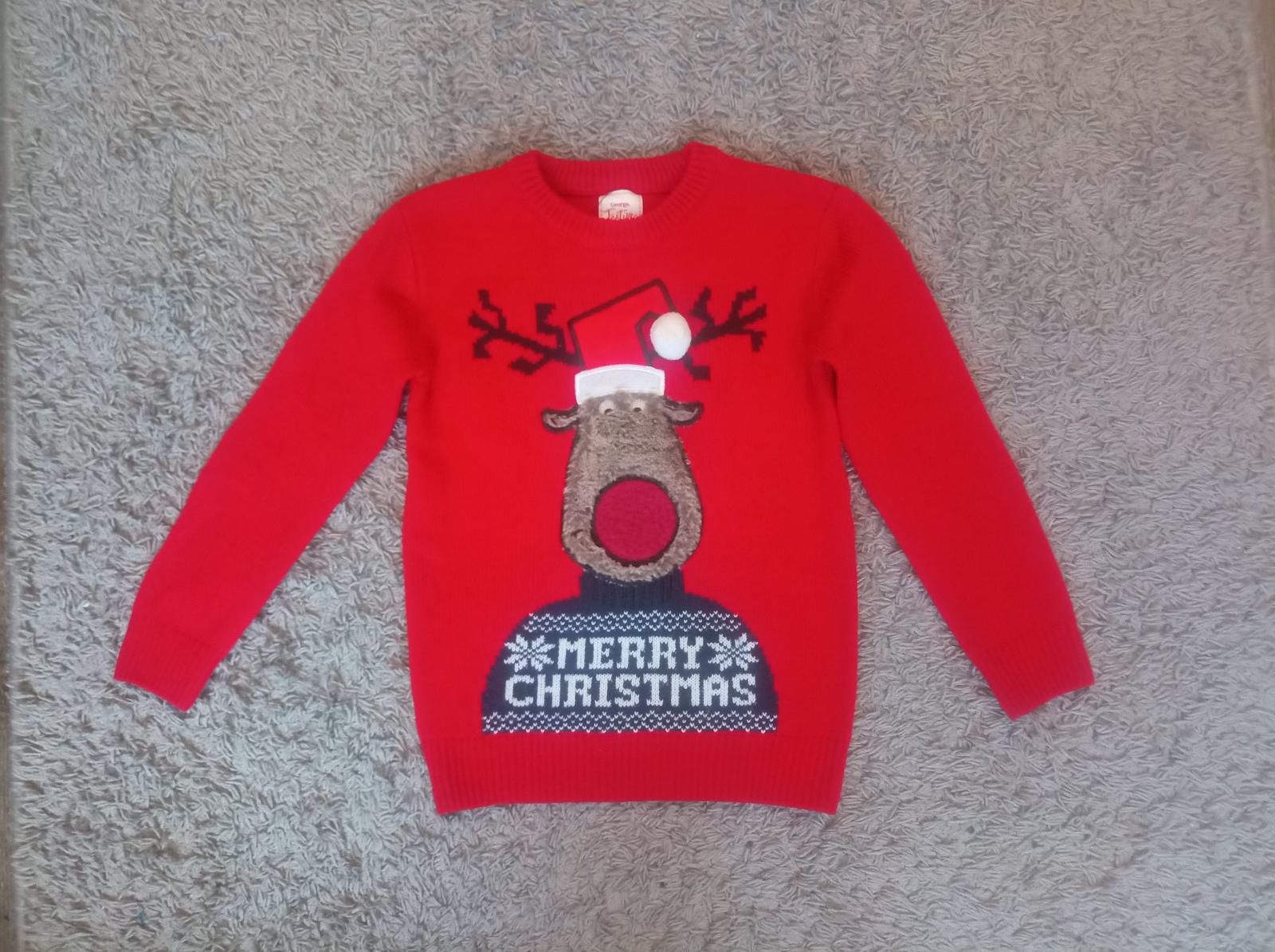 červený svetrík george na vek 5-6 rokov, dĺžka 47cm, šírka 37cm, rukáv od krku 48cm, bežné známky nosenia a prania, cena 2€ plus pošta