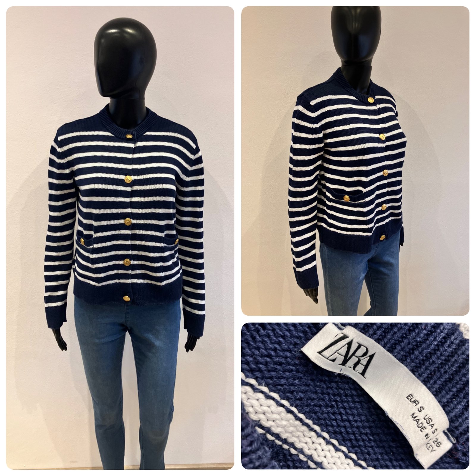 Dámsky sveter, pásikavý, tmavomodro-biely so zlatými gombíkmi, dve predné vrecká, elastický, materiál 100%bavlna.