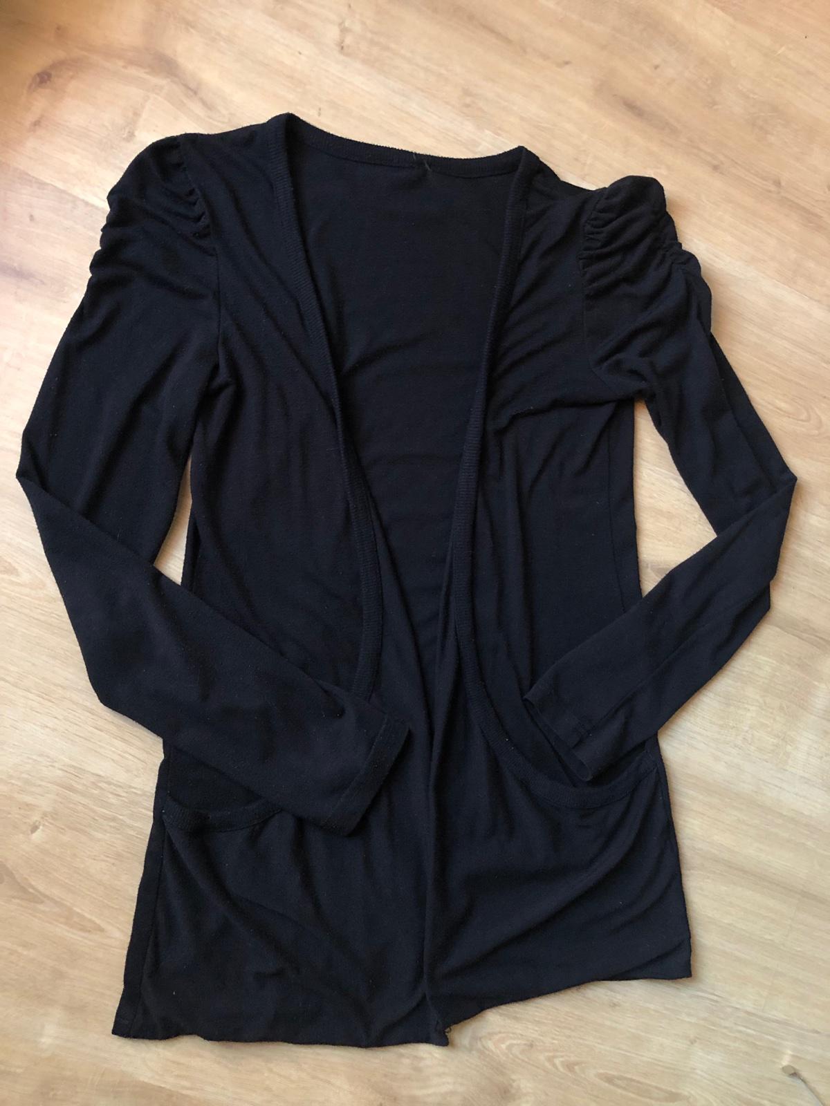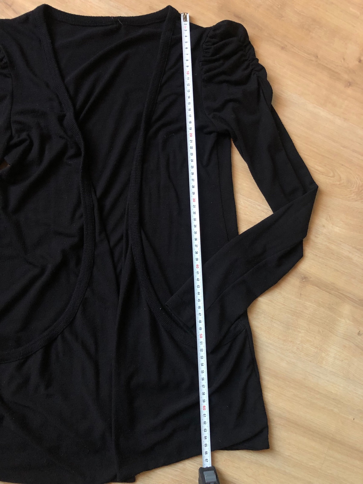 Strapcovy kardigan minimum noseny ziadne poskodenia. Velkost S, znacka AMISU.Rukav od krku 73 cm, od ramena 61 cm. Dlzka prednaj casti najdlhsej 89cm potom uz je dlzka tak 71 cm cize iba predna ca...