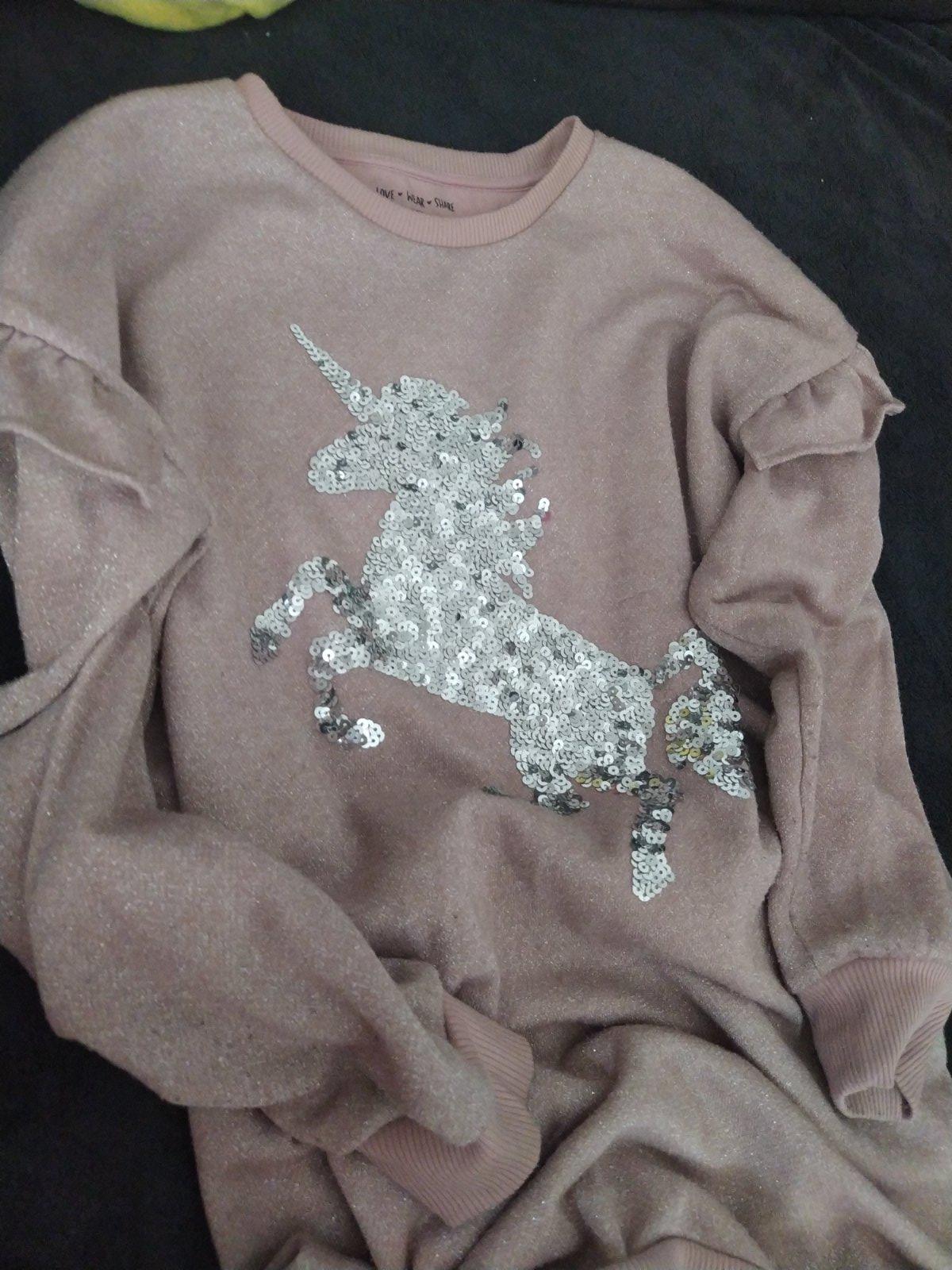 Predam peknu dievcensku mikinku, bledoruzovej farby so striebornym nitovanim, strieborne flitre jednorozca vpredu. Na ramene volaniky. Teplakovity material. Zn. F&F. Velkost je uvedena 14-15 rokov,...