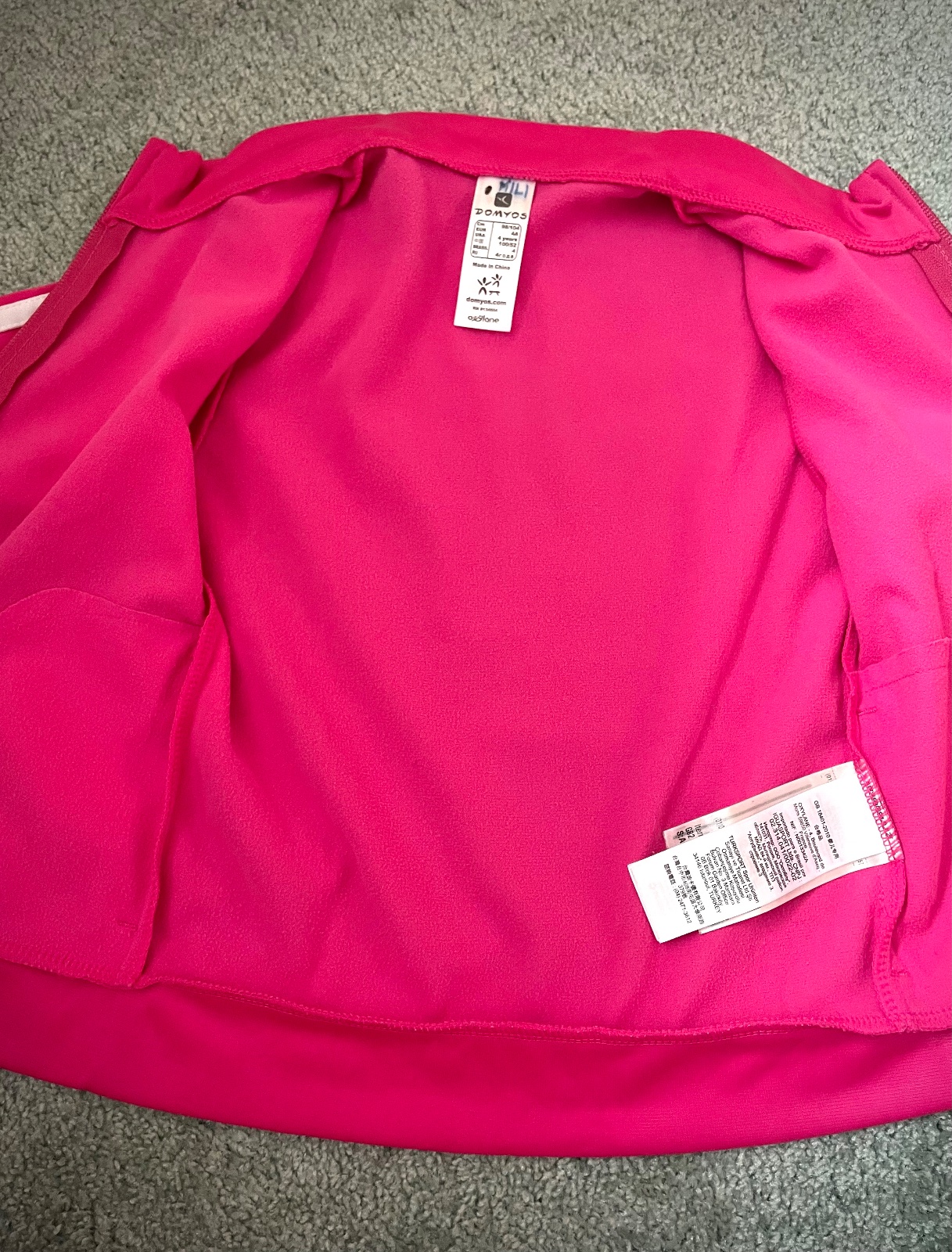 Pohodlná športová bunda na zips značky Domyos. Minimálne nosená, vemi dobrý stav. Veľkosť 98/104. Na vnútornom štítku je zaznačené meno a čierna bodka.
