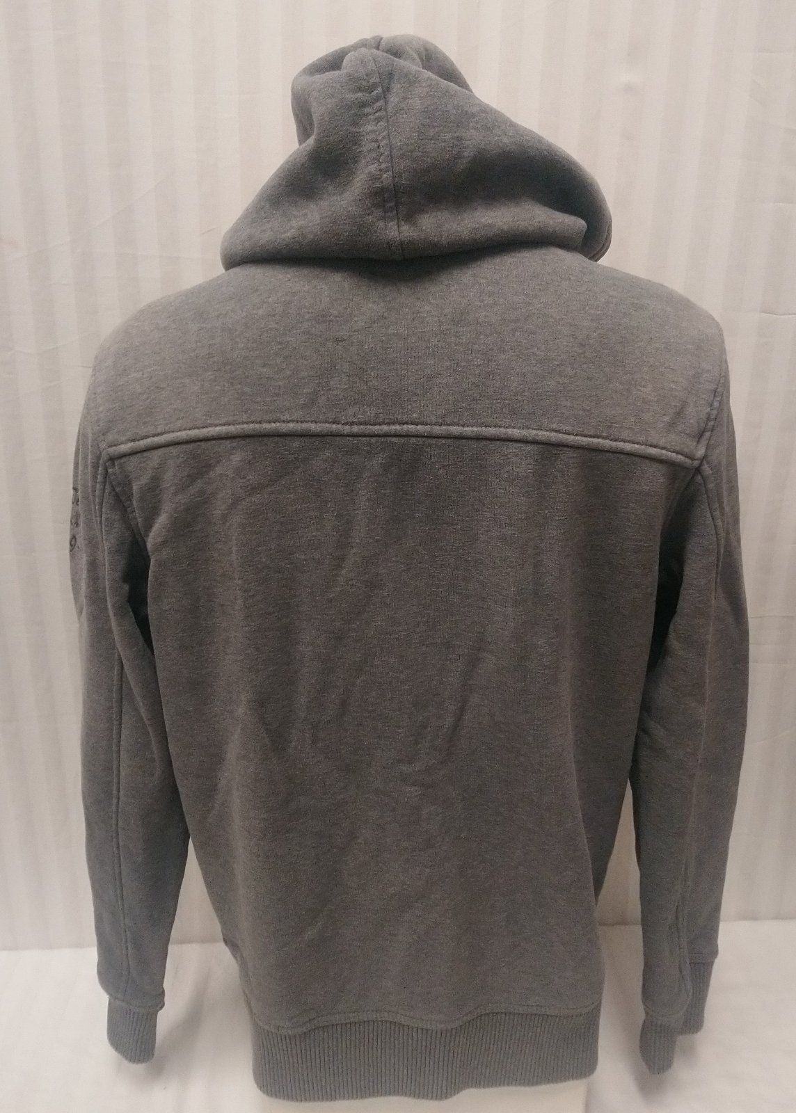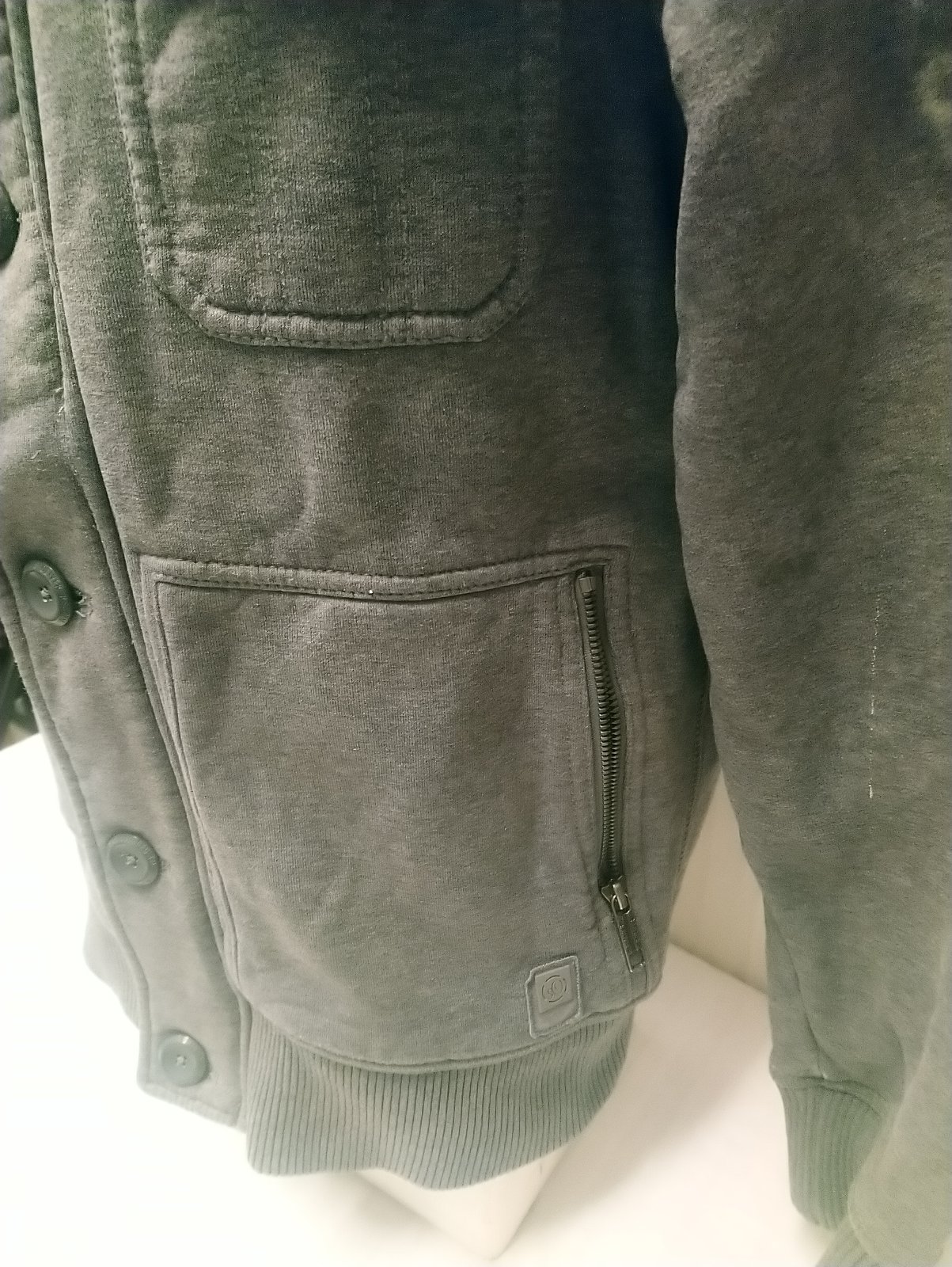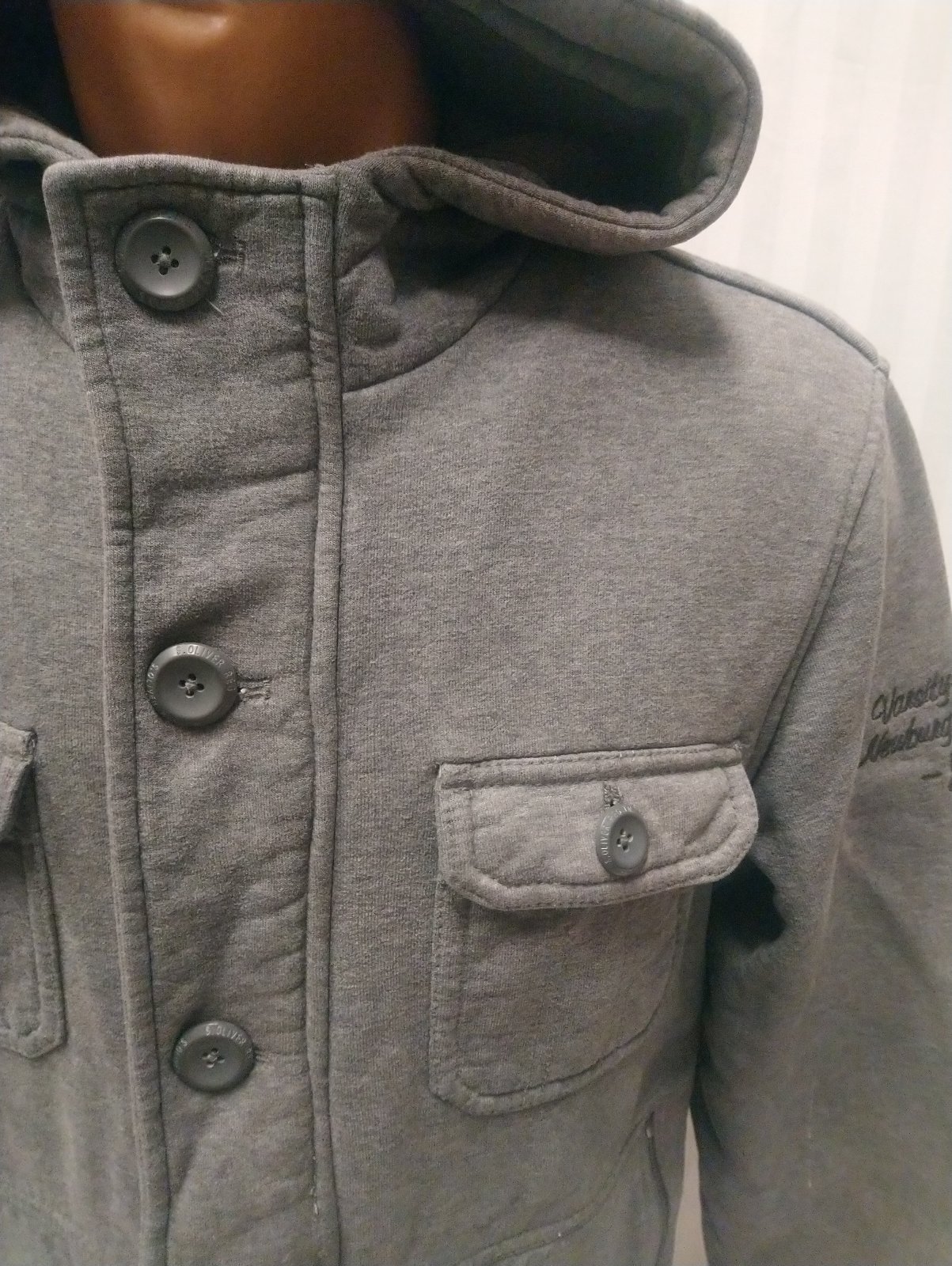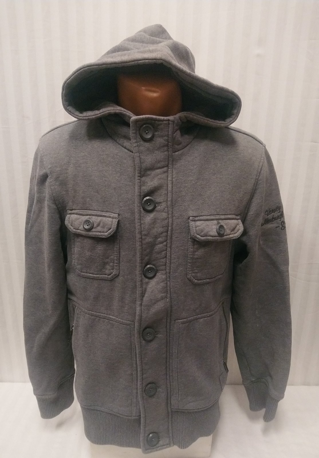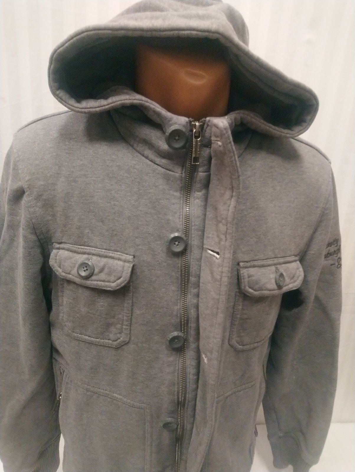 pánska sivá mikina s kapucňou so skrytým zapínaním na zips a zapínaním na gombíky, náprsné vrecká na gombík, dolné vrecká na zips, na rukáve nápis, stredne hrubá,