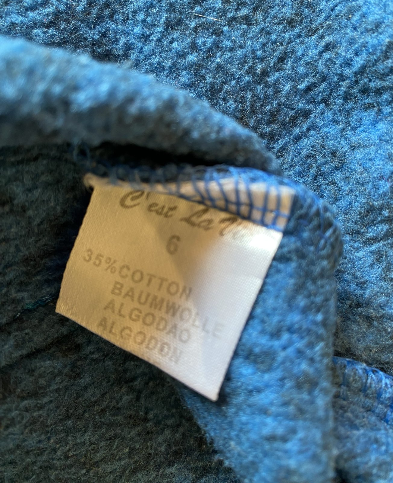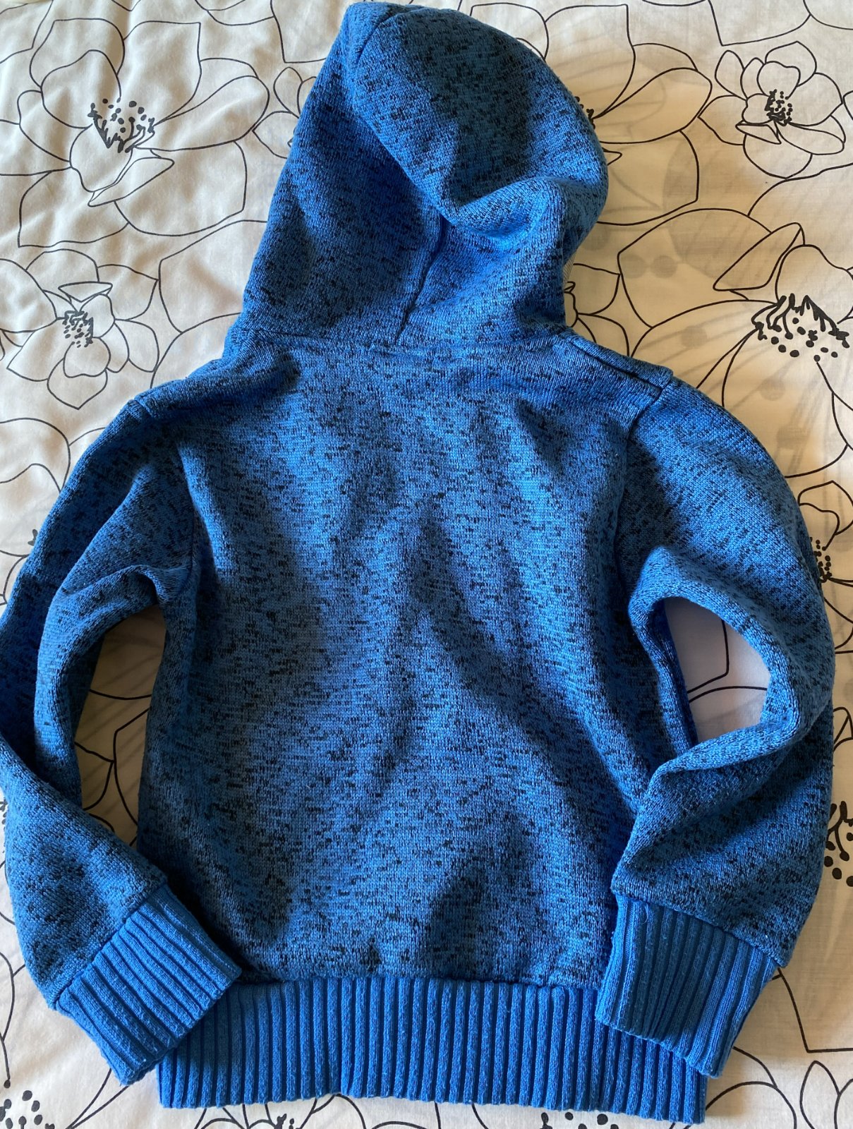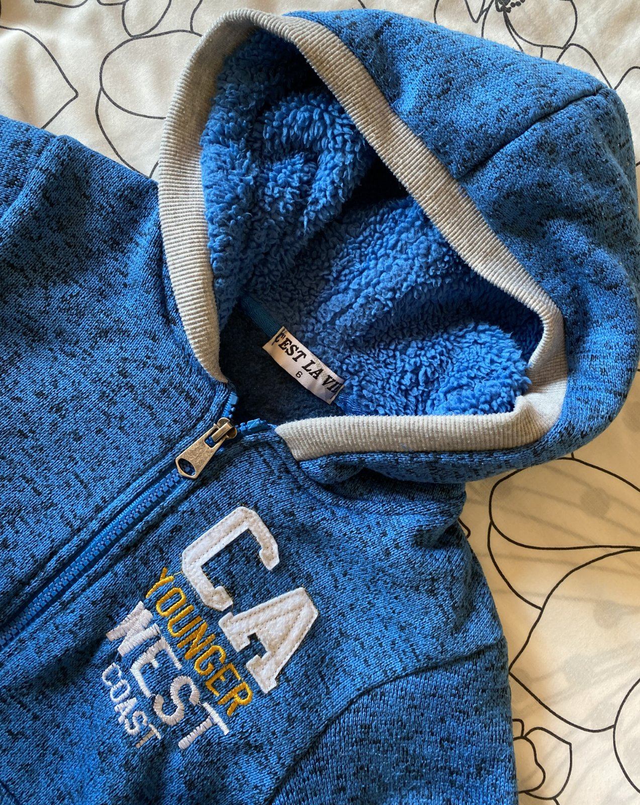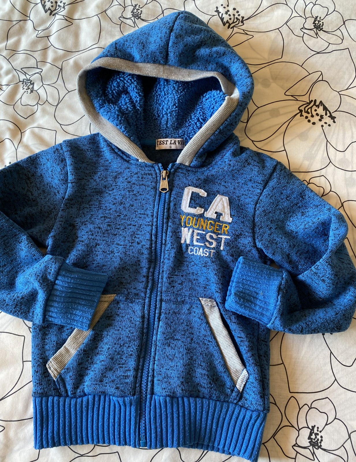 Teplá mikinka s kapuckou Cest La Vie v. 116, veľmi pekne prepracovaná, kopa detailov, materiál 65% polyester, 35% bavlna, pekná modrá farba - melír v kombinácii so šedou, málo nosená na striedačku s inými.