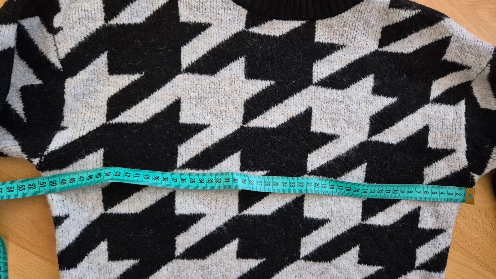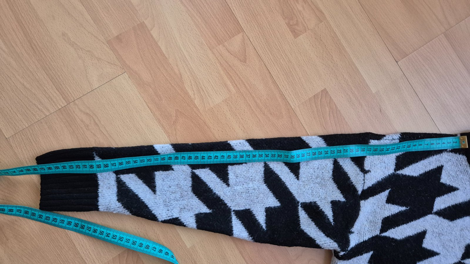 Sveter malo noseny, bez poskodeni, velkost pisana XS ale sadne od XS (oversize) az po M. Kupovanu v Takko. Miery na fotkach.