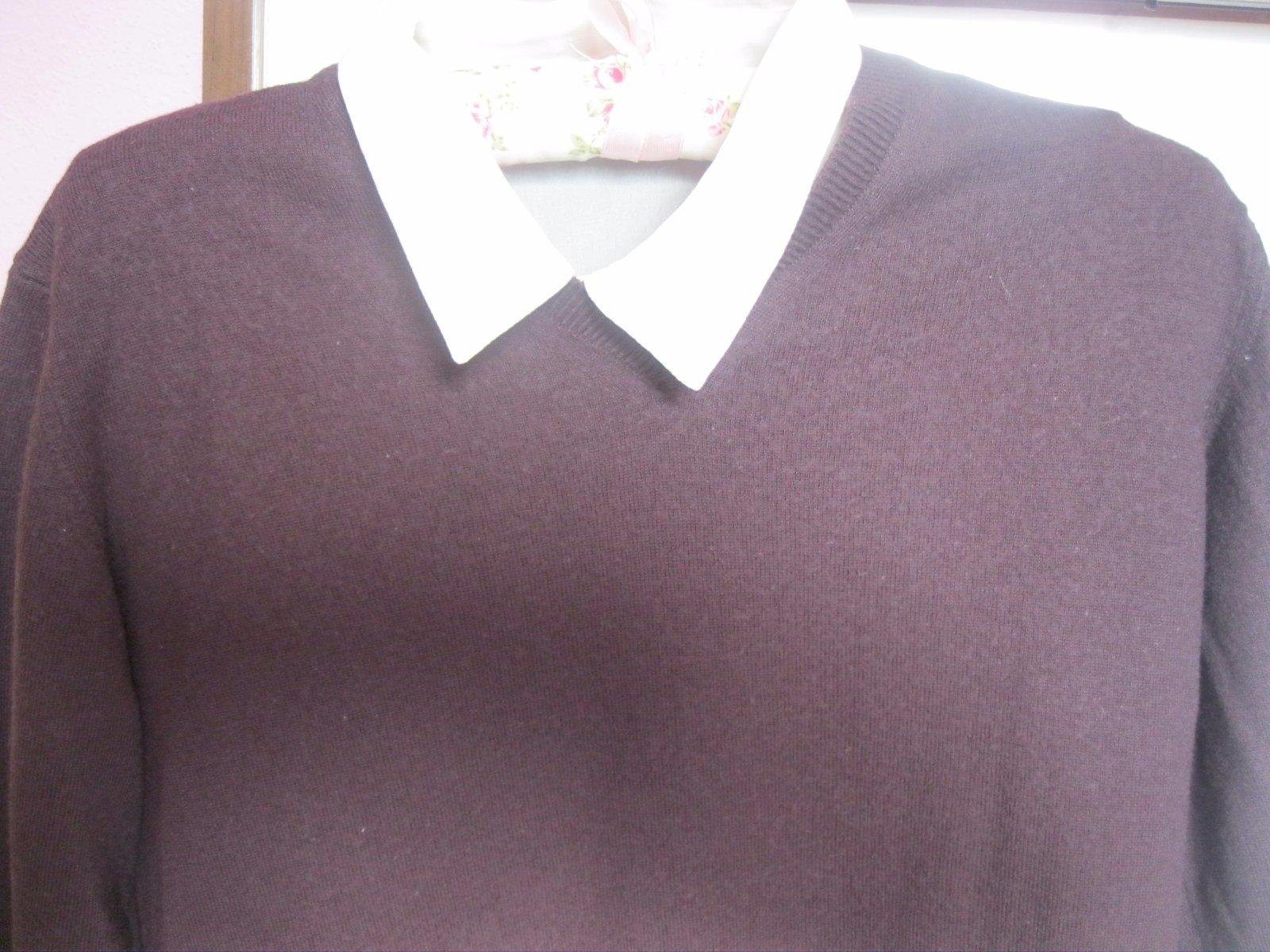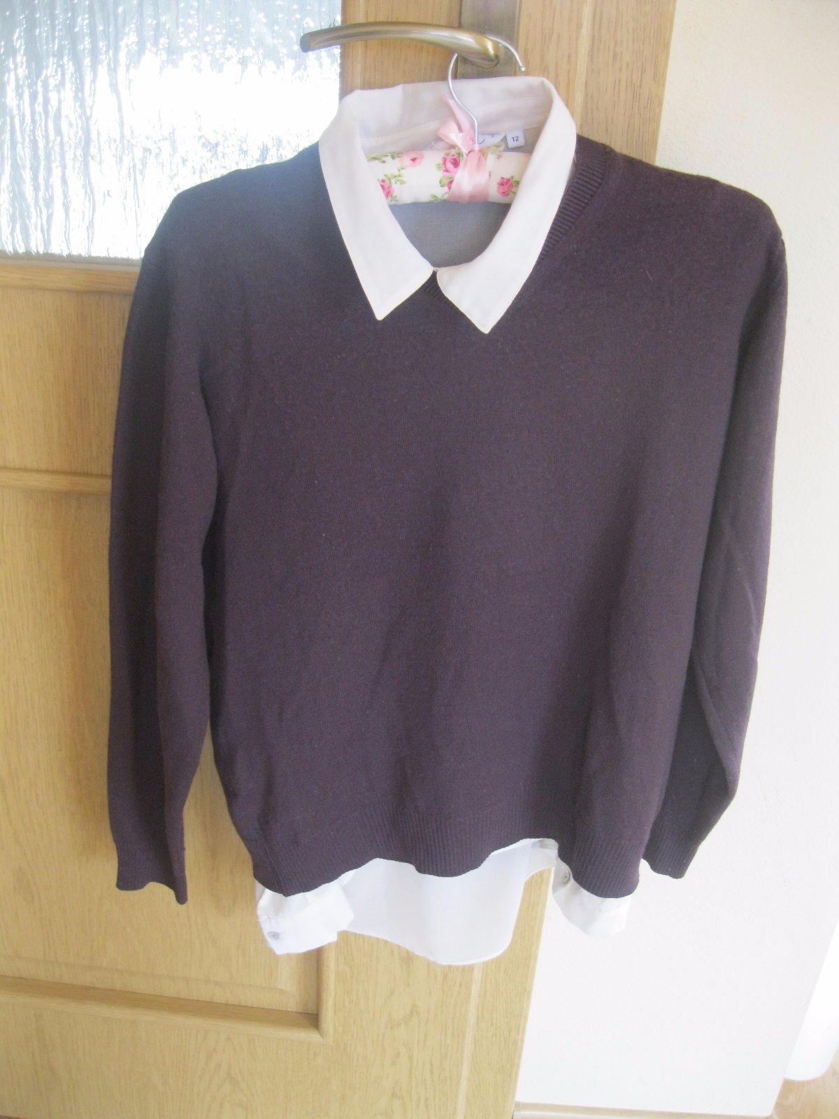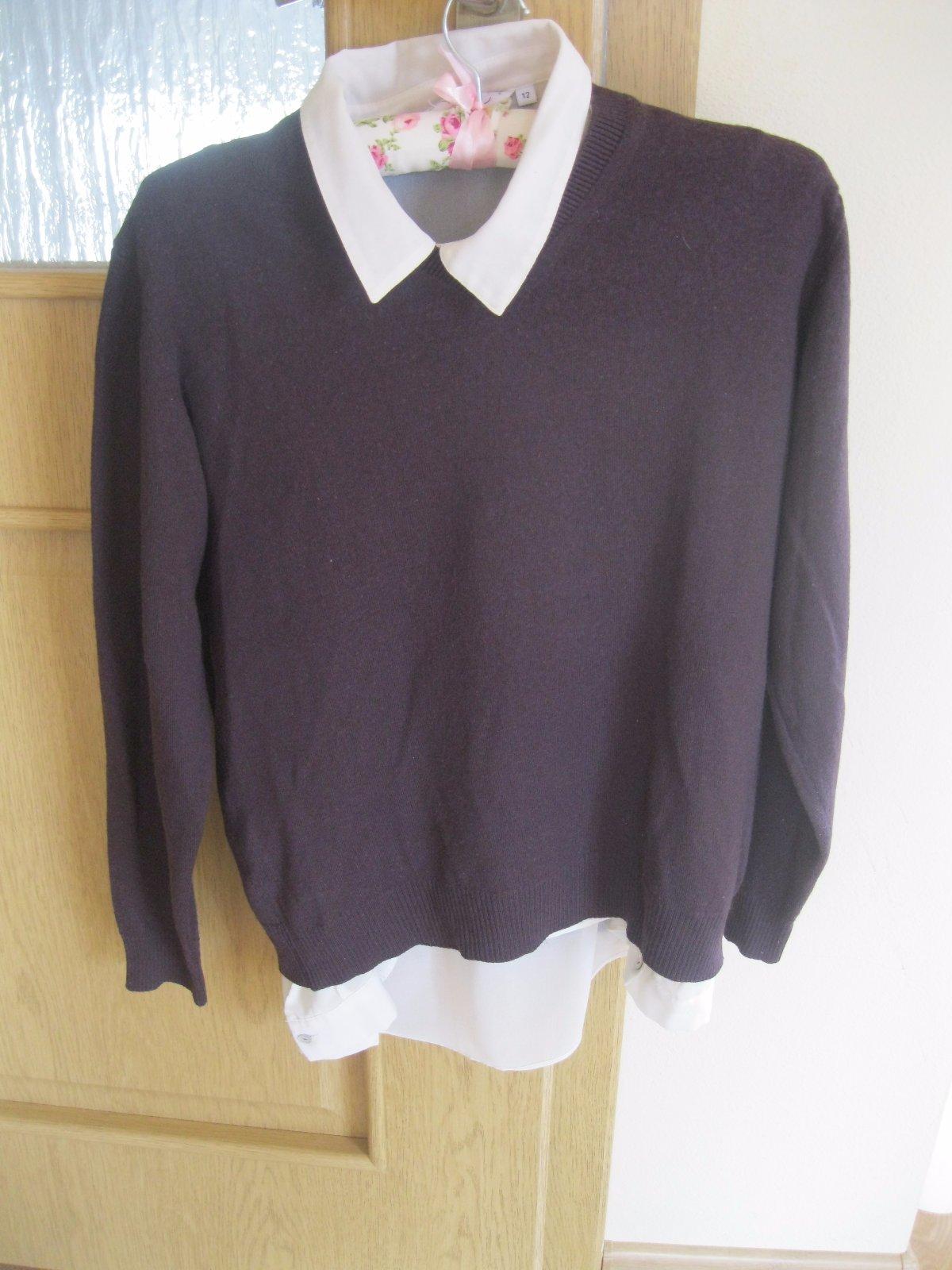 Tmavofialovy svetrik, velkost pisana L, ale podla mna kludne aj M, kusocek zmolky vpredu - posledna foto, neskusala som odstranovat, predava sa bez bielej kosielky, ta je len pre predstavu, ako sa da pekne nosit, veckovy vystrih, na spodu aj na rukavoch patent, 50% vlna merino, 50 % akryl. Dlzka je 60 cm, sirka od pazuchy k pazuche je 47 cm.