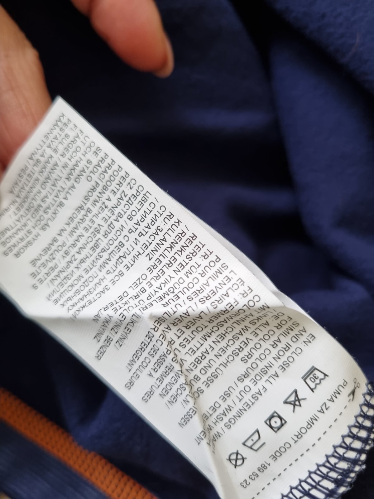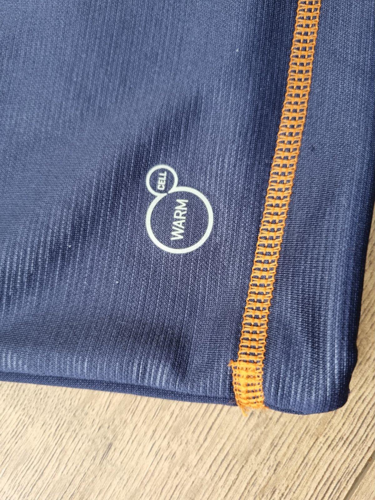 Farba je tmavomodra (tmavsia modra ako na foto - na foto je trochu zosvetlena fotakom) v kombinacii o oranzovymi detailami. Materiál je zmesový syntetický, z akého sa teraz robí športové oblečenie z časti - cez rukávy akoby vtlačený vzor ( na foto ťažko vidieť ) no zvnútra mierne zateplená, nie je flisová ani tepláková