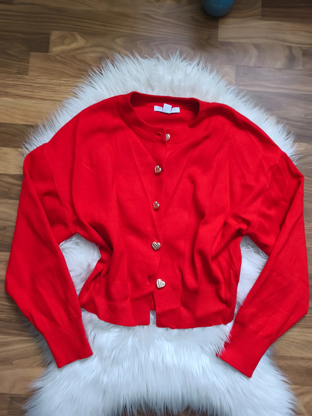 Dámsky štýlový svetrík, veľkosť písaná XL, sedí skôr na veľkosť L, rozmery viď na foto. Krásne gombíky srdiečka.