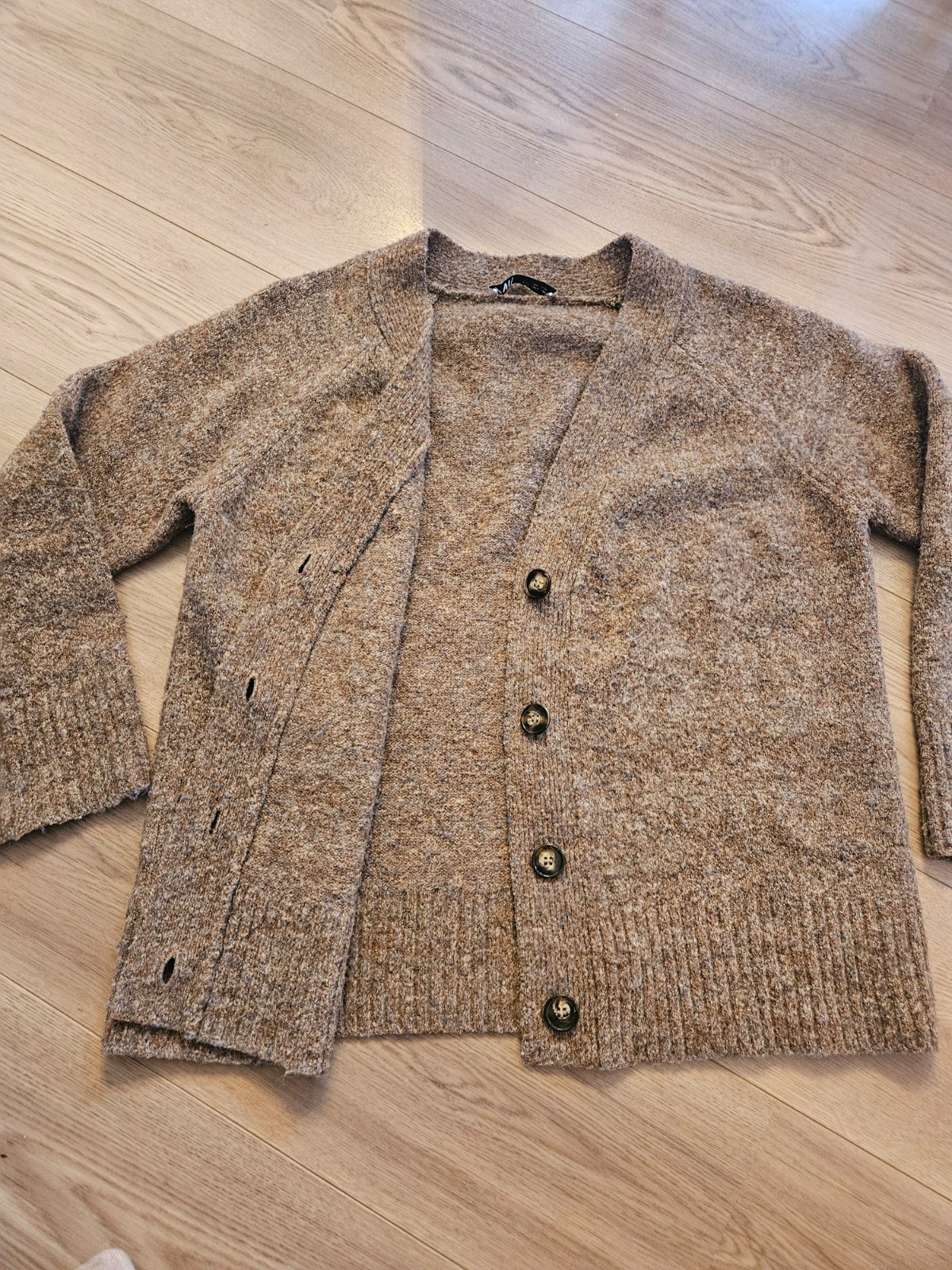 Nosený kvalitný kardigan, hrubší., je nosený, má žmolky.,( zohľadnené v cene) po bokoch dve efektné vrecká