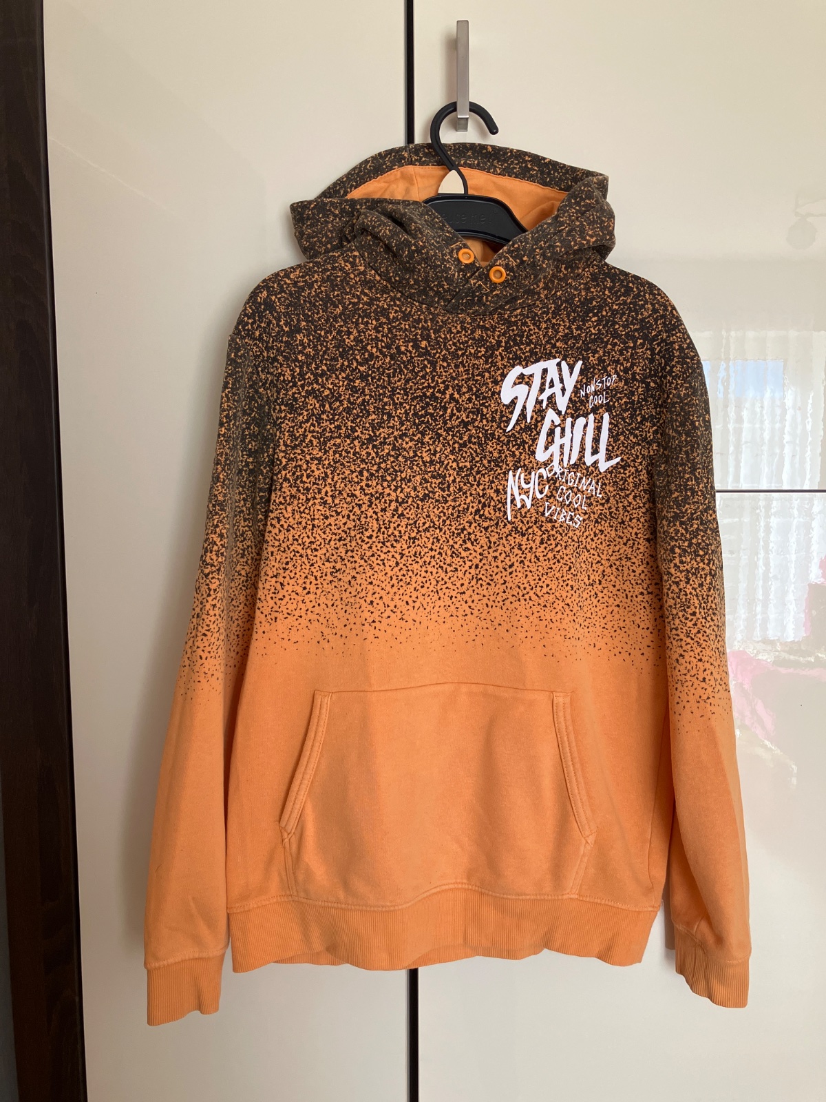 Tenšia nezateplená mikina príjemne oranžovej farby, nie je krikľavá, skôr pastelový nádych. Bez dierok a fľakov. Len bežné známky prania. Veľ: 146/152