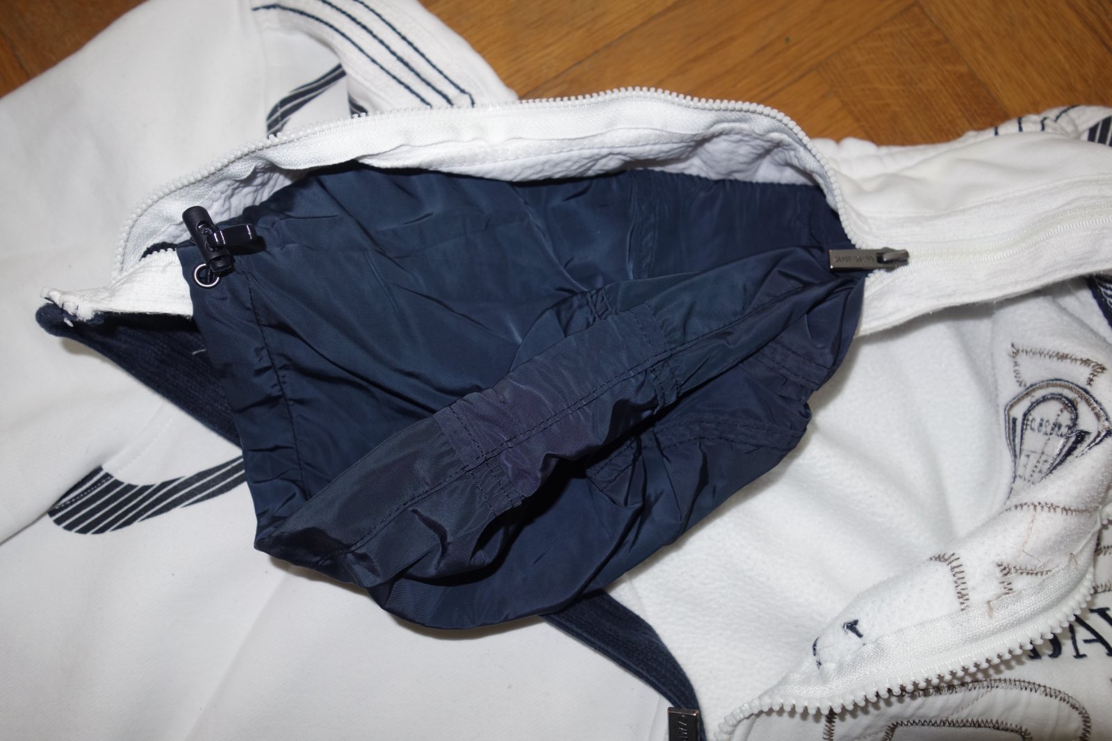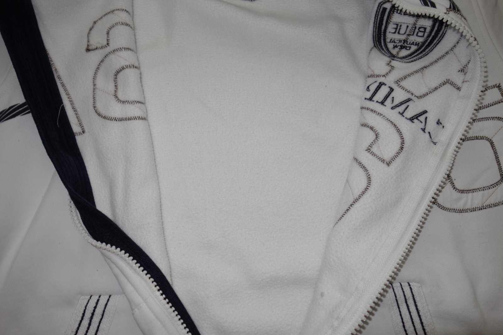 Výborný stav. Hrubá teplákovina. V stojačiku kapucňa (vyberateľná). Zapínanie na zips. 70% bavlna, 30% polyester.
