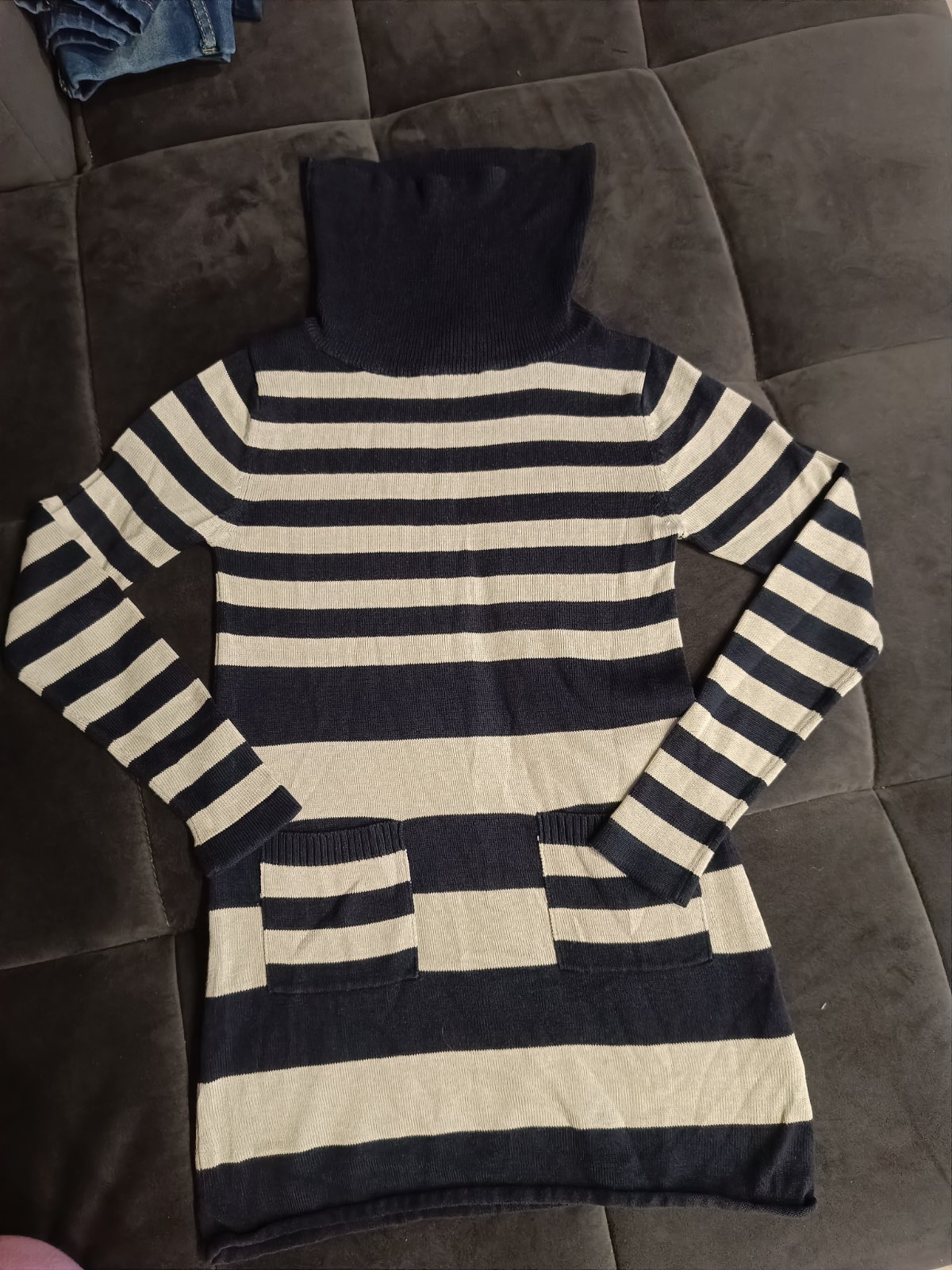 Štýlový dievčenský rolákový sveter v ecru farbe s tmavomodrými pruhmi. Pohodlný, hrejivý a ideálny na bežné nosenie aj do školy. Dostupný vo veľkostiach 4–14 rokov. Doprajte svojej slečne nadčasový...