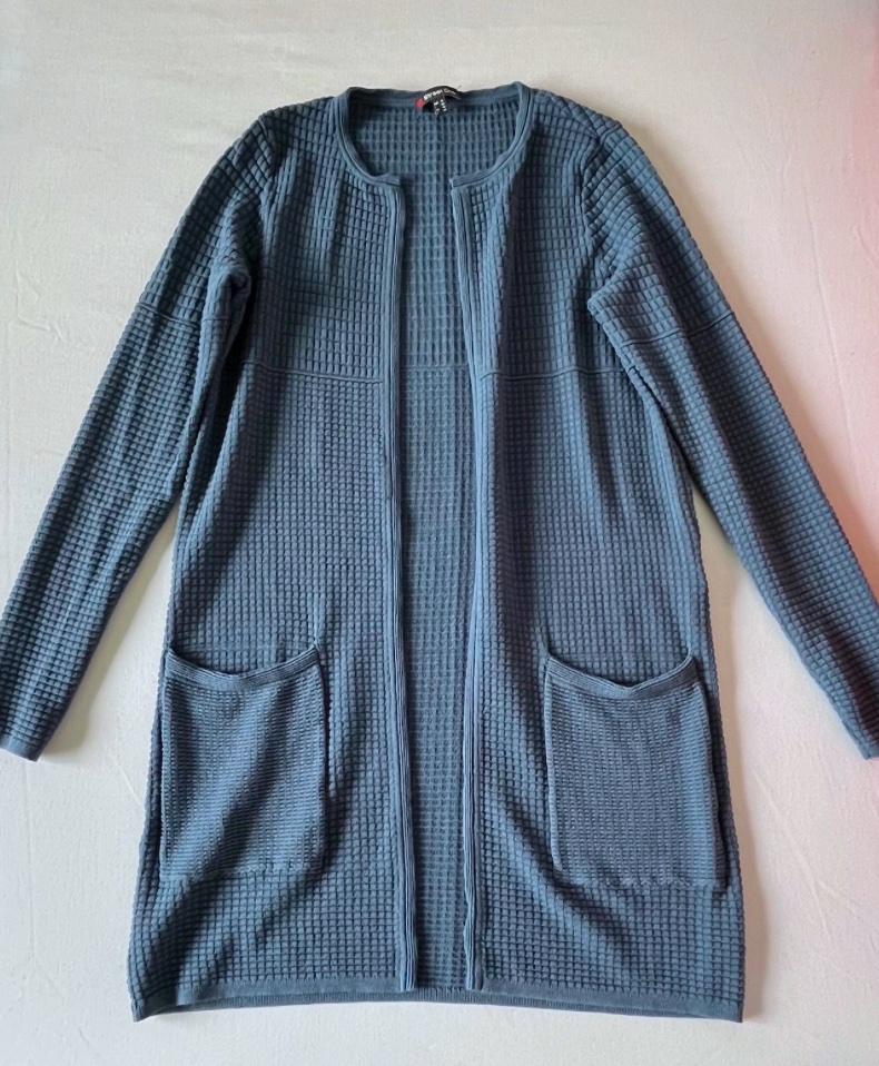 Top stav, farba modro-sivá......štrukturovaný materiál.....d 75 cm, š 46 cm, rukáv od krku 67 cm....