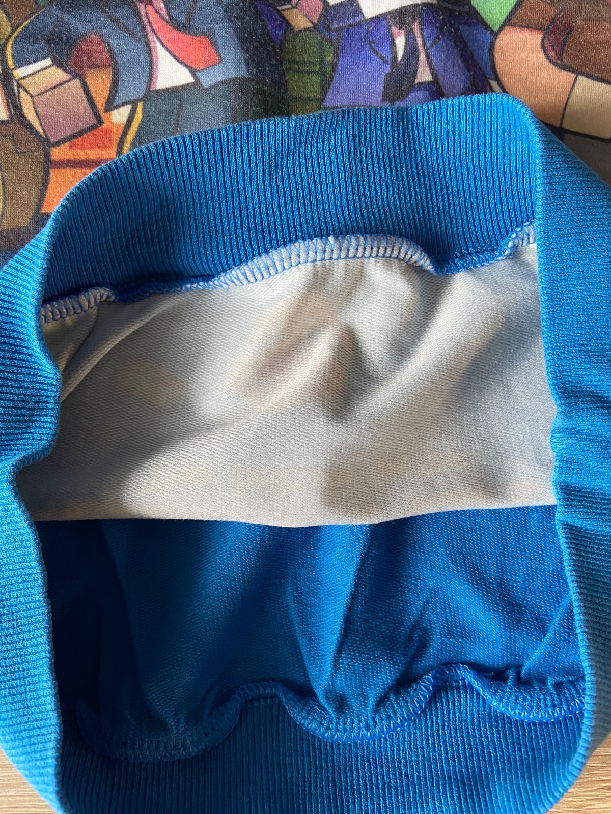 Nosena mojim synom. Bežne známky nosenia. Logo vyšité. Farba bledomodra, s tmavomodrou a bielou. Veľkosť písaná 140/152. Rozmery:dlžka-56cm,šírka-2x47cm,rukáv od krku 65cm