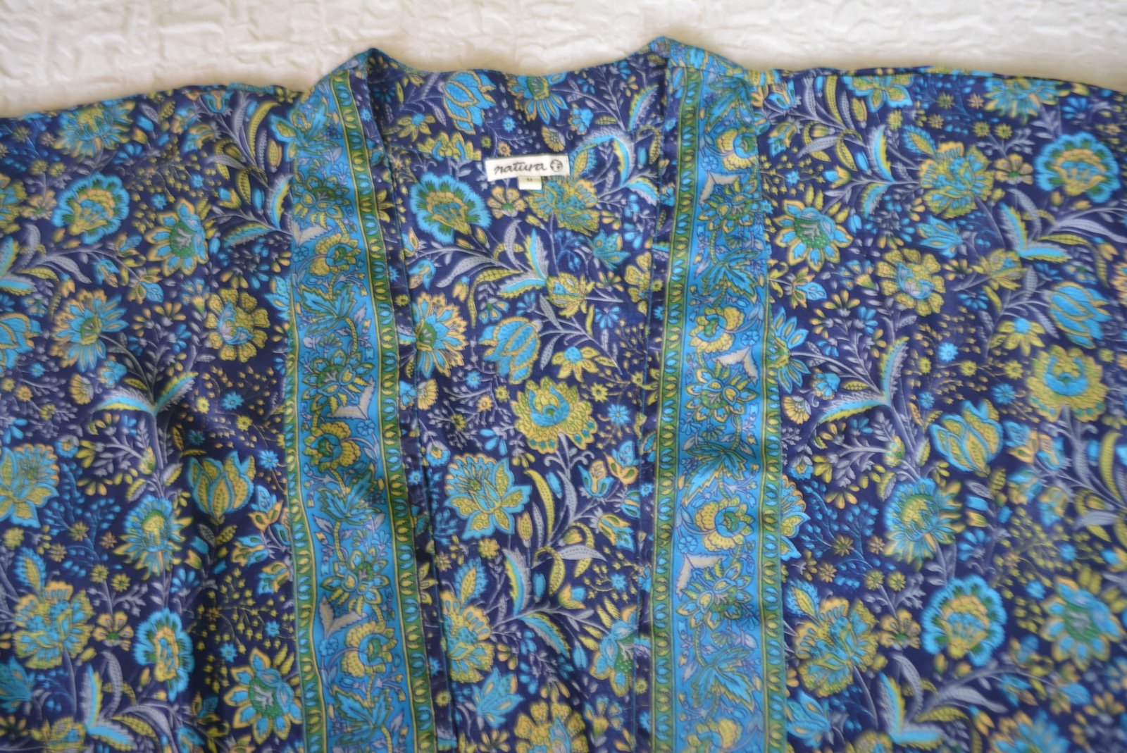 Letný kardigán Natura, veľ. XL, rozmery: dĺžka 74cm, pod pazuchami 60cm, rukáv raglánový od krku 66 a od pazuchy 45cm.