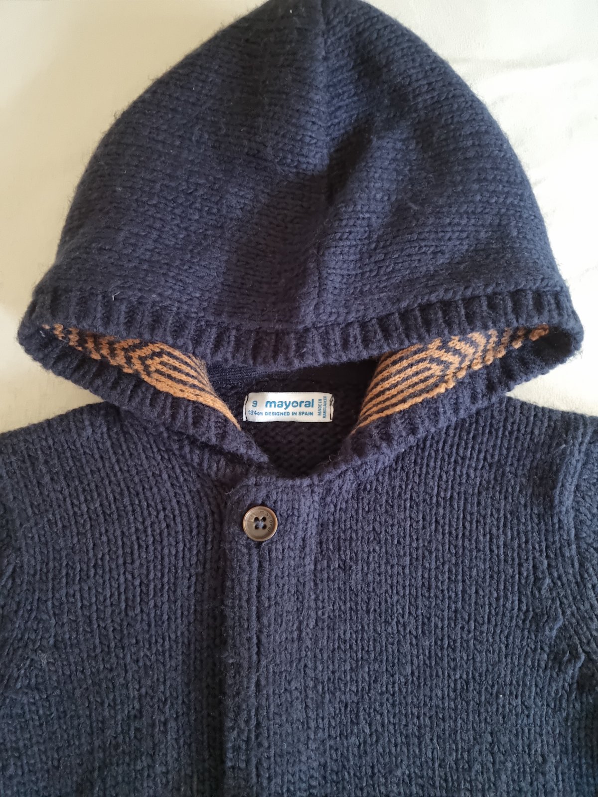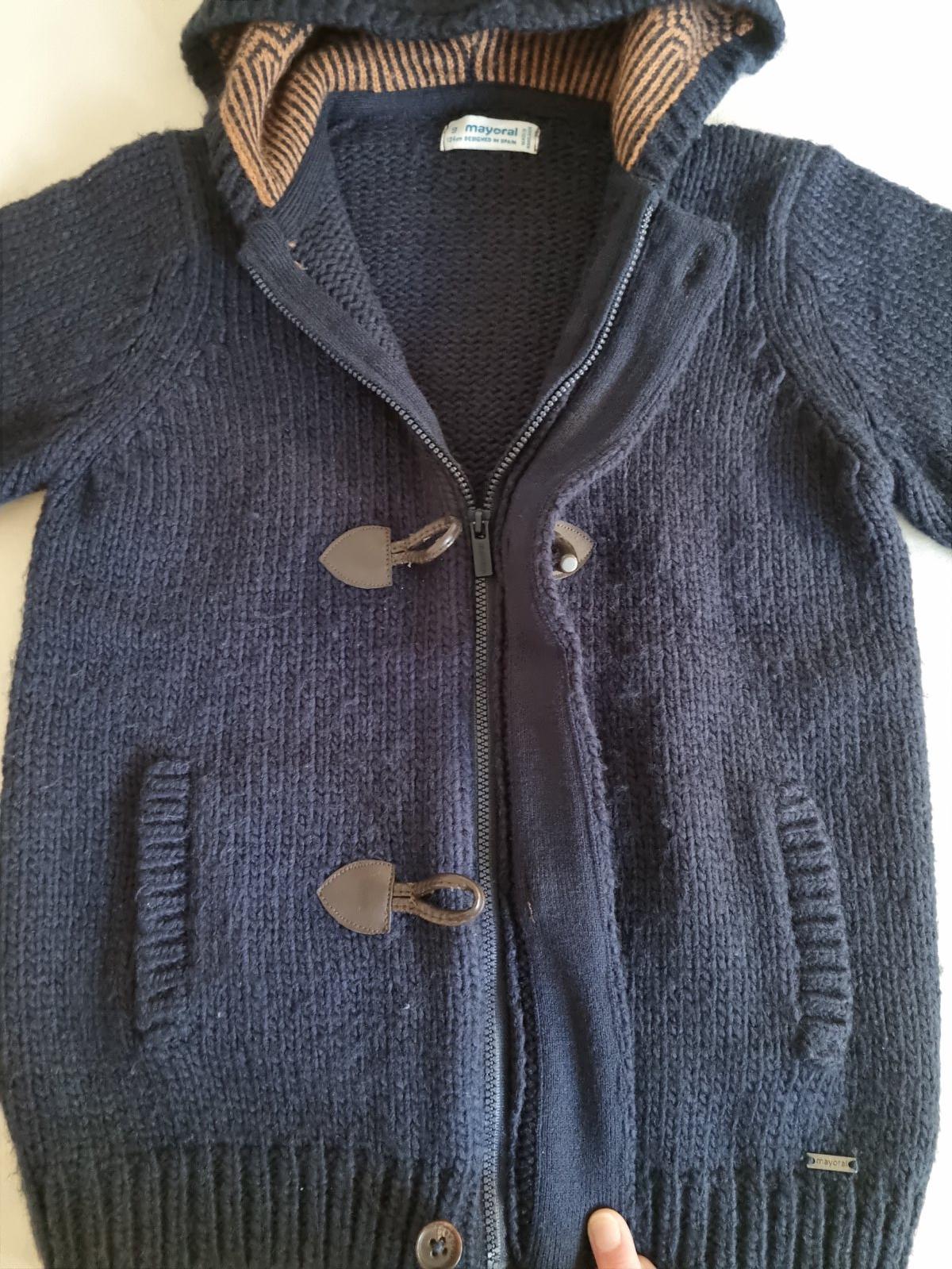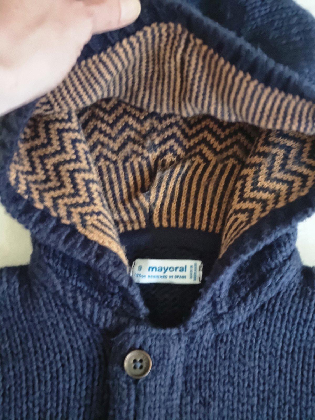 Frajerský hrubý svetrík s kapucňou, zapínanie na zips a cez to gombíky. Značka Mayoral. Veľmi dobrý stav. Farba sýto tmavomodrá, tie svetlejšie foto vyťahal foťák.