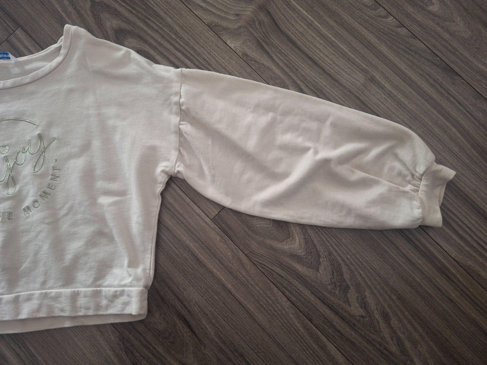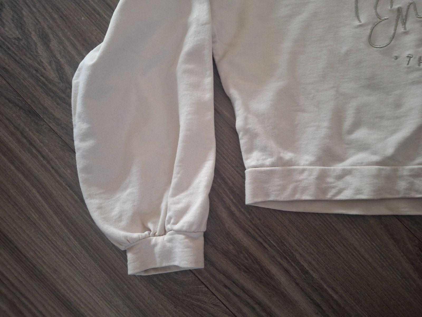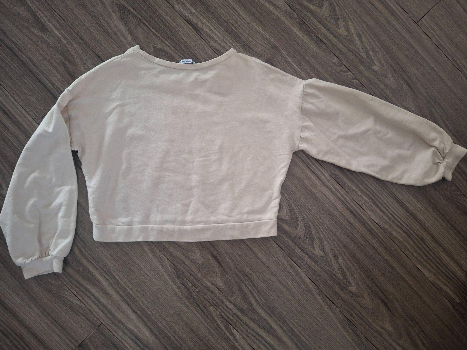 Mikina má veľkosť 157. Bledohnedá mikina s naberanými rukávmi; látka je pretkaná lesklými nitkami.