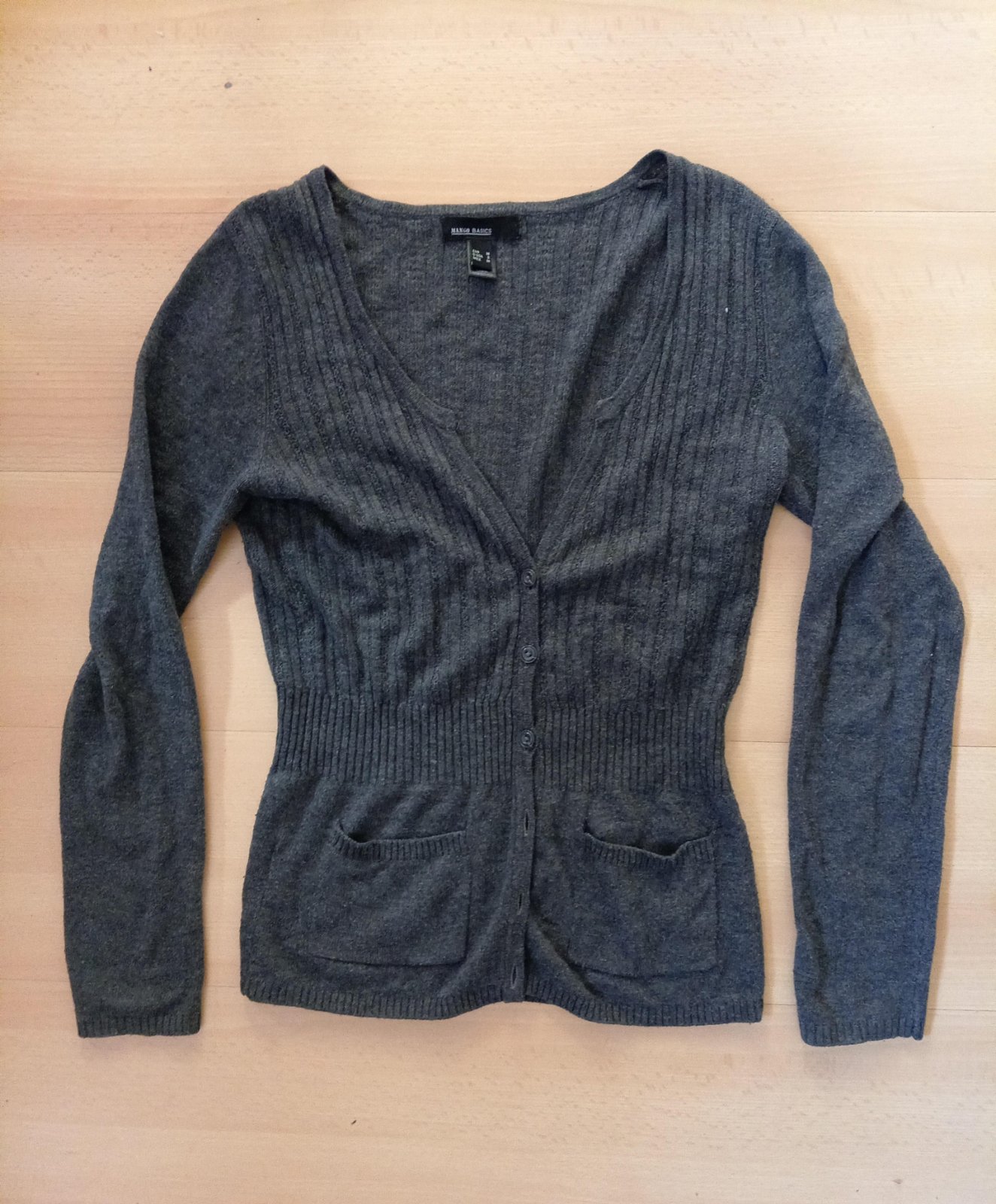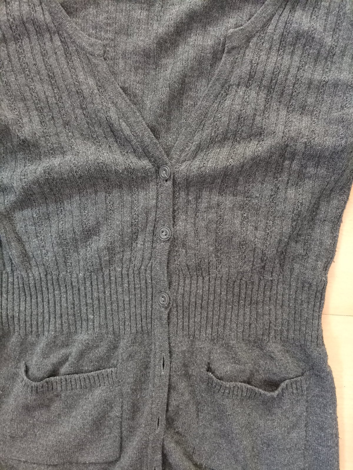 Jemný úplet, na spodnej časti vrchné vrecká, nepoškodený.