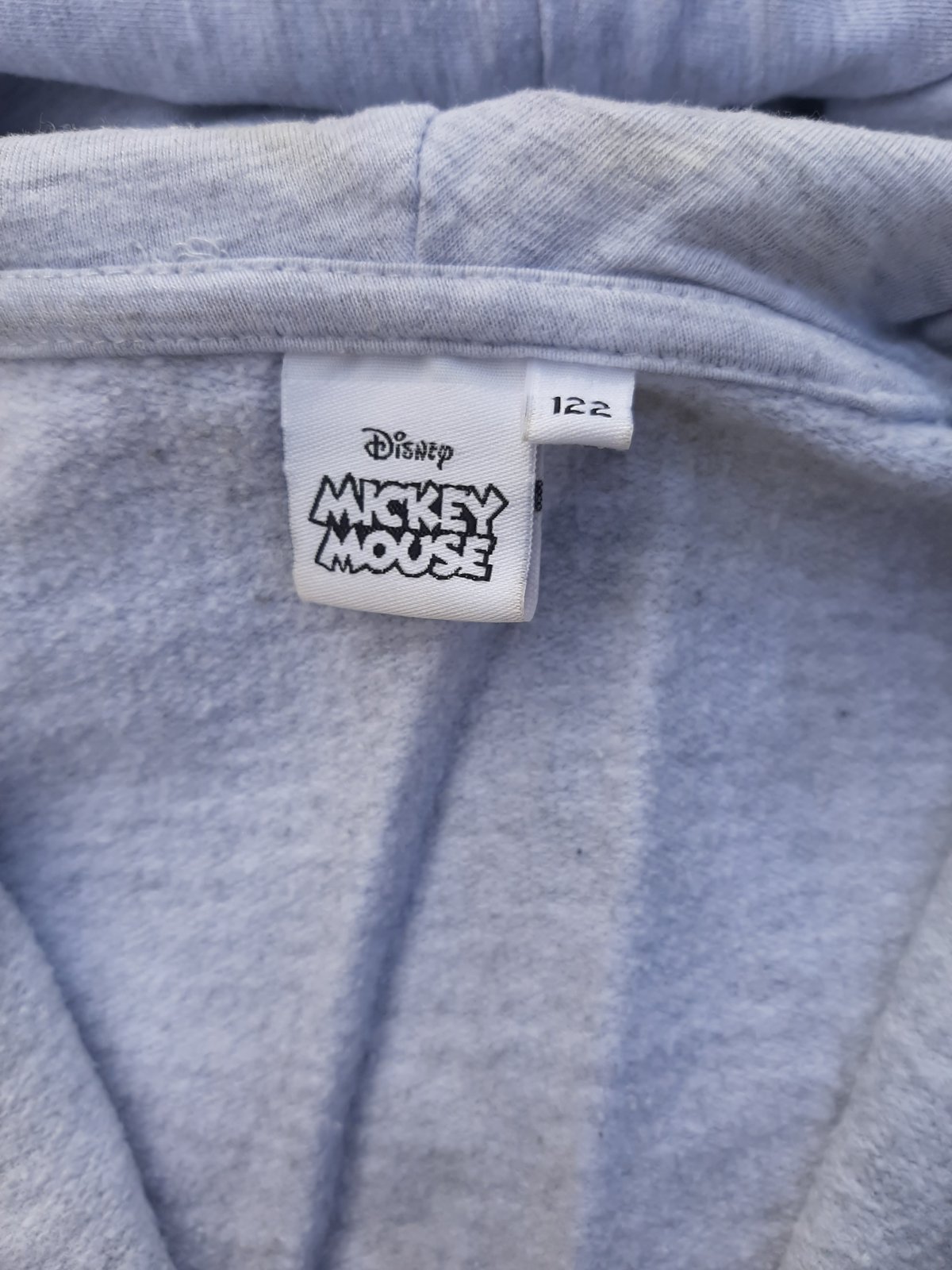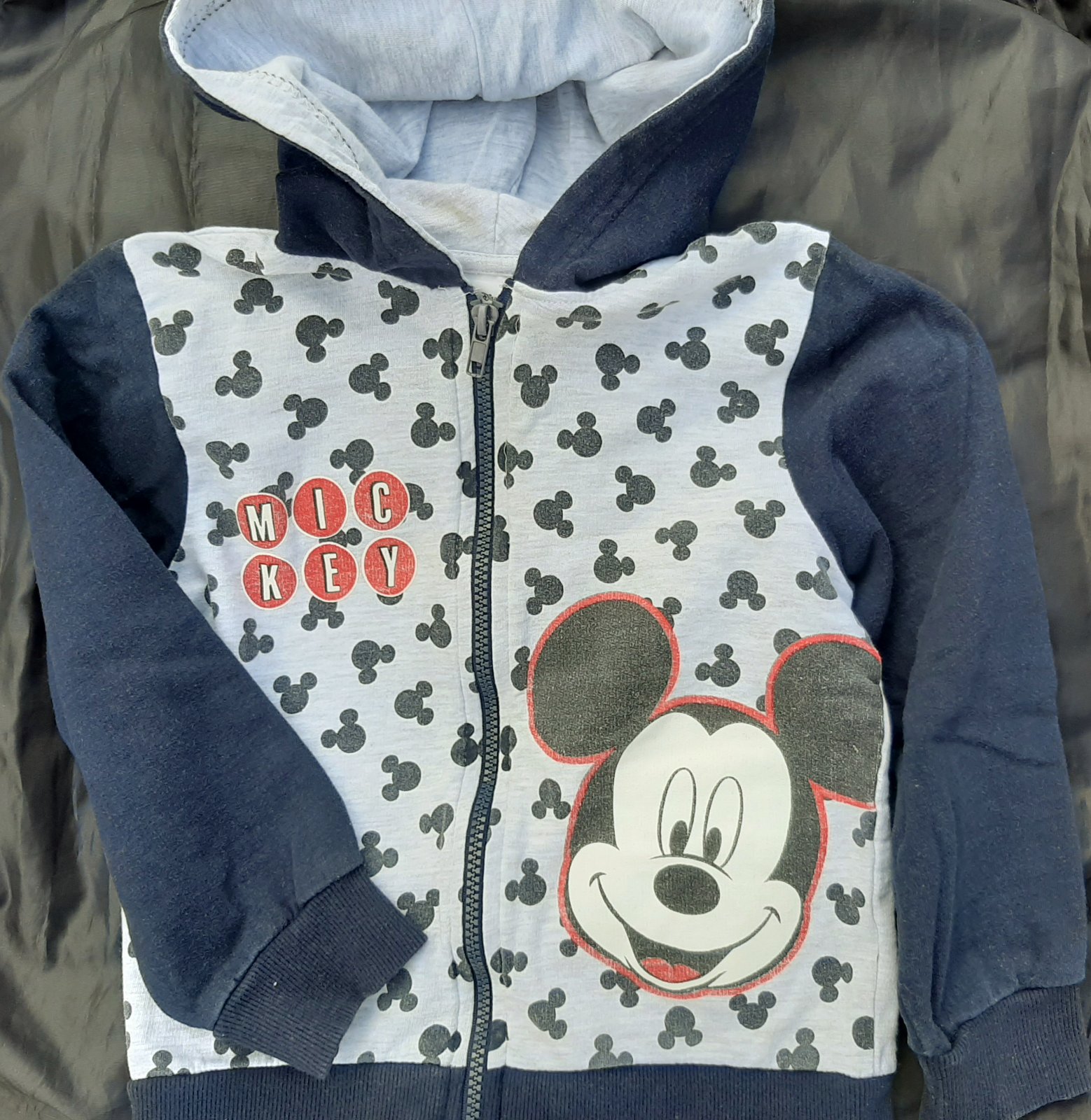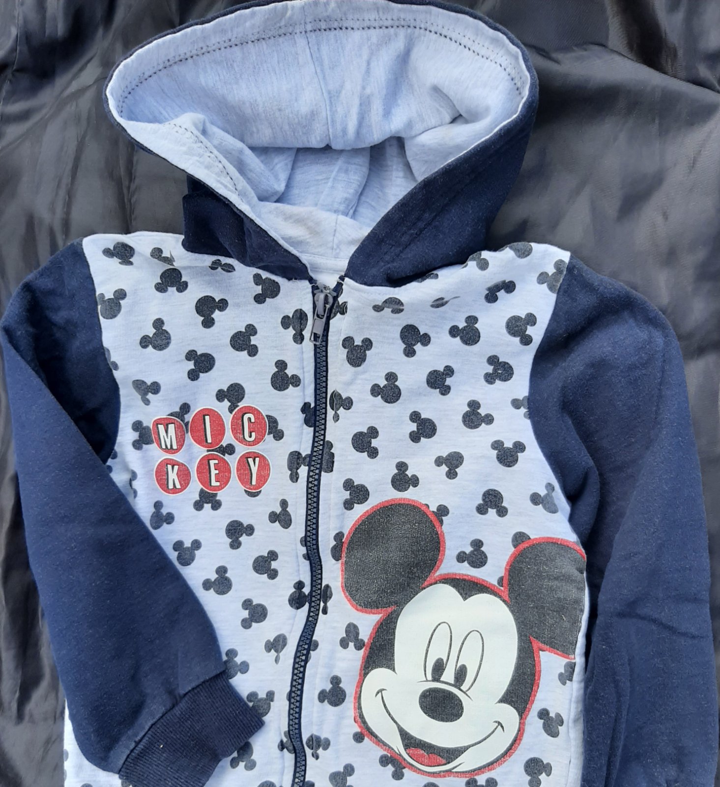 Mikina pekná, neznicene. Na aplikácií A a vnútorné kapucne trochu žmolky, a na ľavom rukáve odzadu svetlý fliacik, ani nie je vidieť. Dĺžka 45 cm