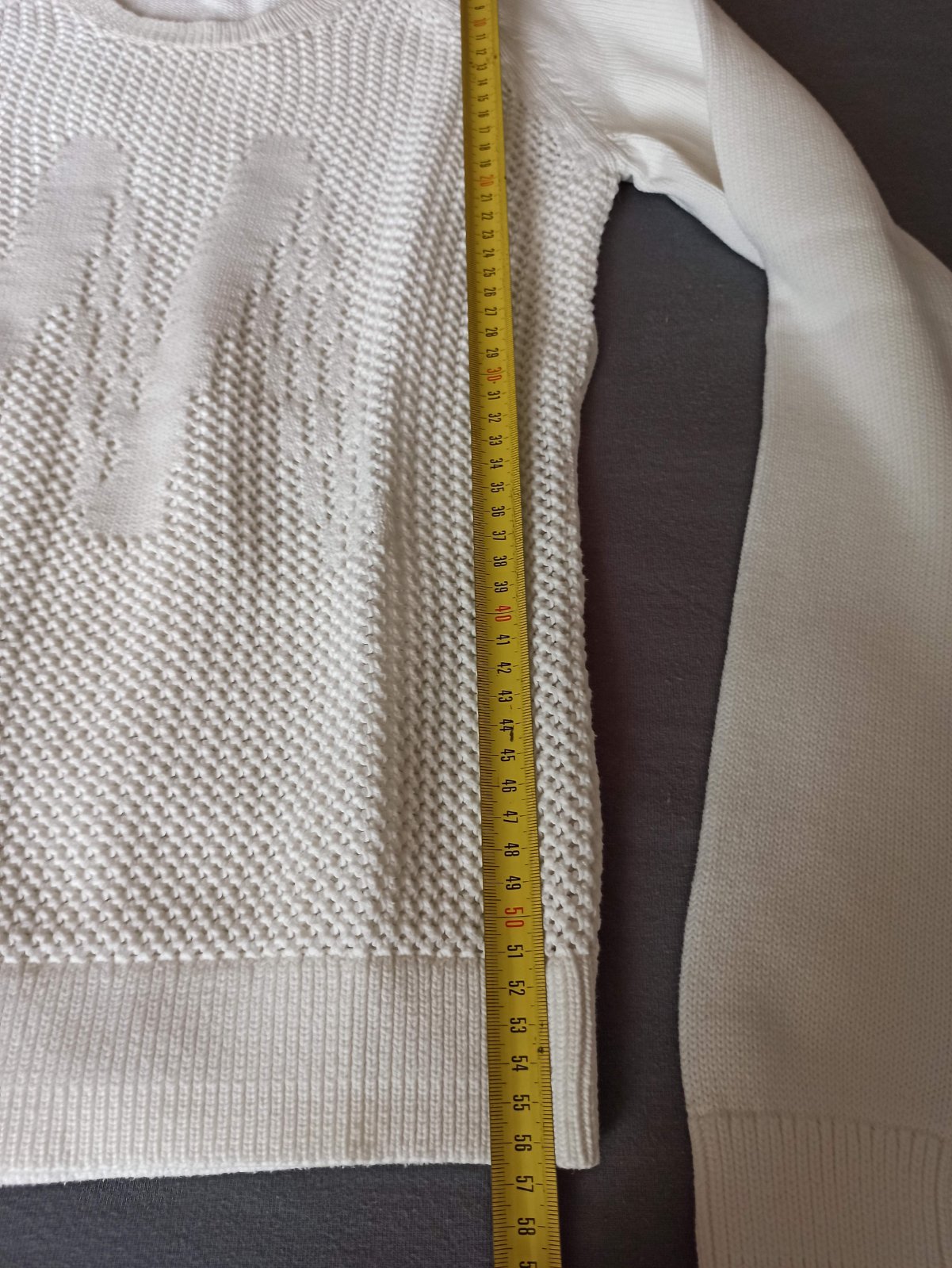 Bavlnený pulóver, párkrát oblečený, vo veľmi dobrom stave, ako nový, biely, predná časť mierne priesvitná (väčšie očká)