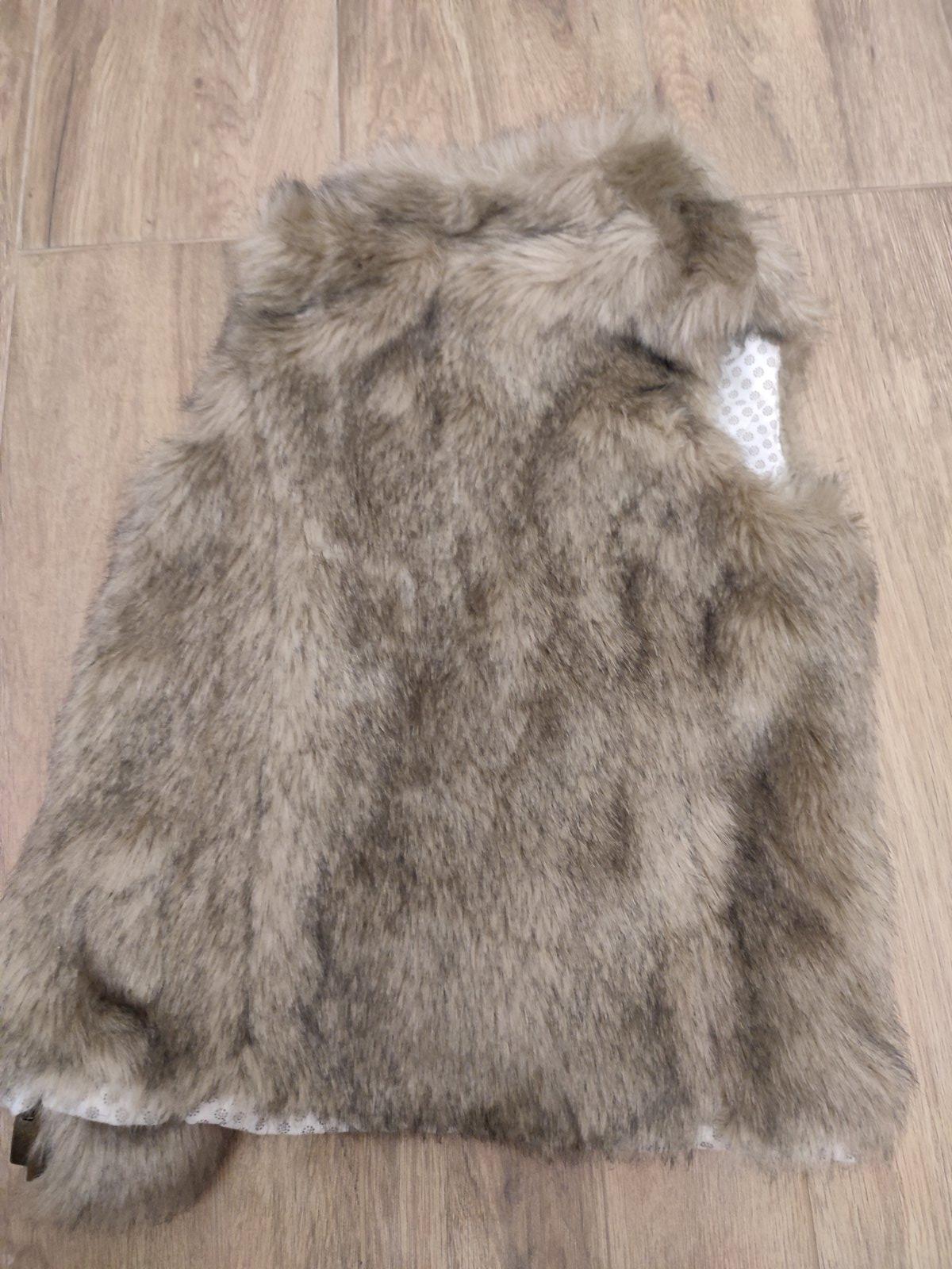 Pekna vesticka z umelej kozusinky vo velmi dobrom nosenom stave. ROZMERY: celkova dlzka od pleca: 42cm, sirka pod pazuskami: 36cm