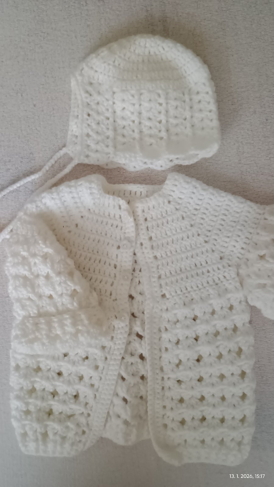 Predám krásny svetrík s čepčekom, robený na zákazku oblečený len raz, dcérka sa narodila malička teraz už ho neoblečie, krásna práca, kľudne aj na krst.