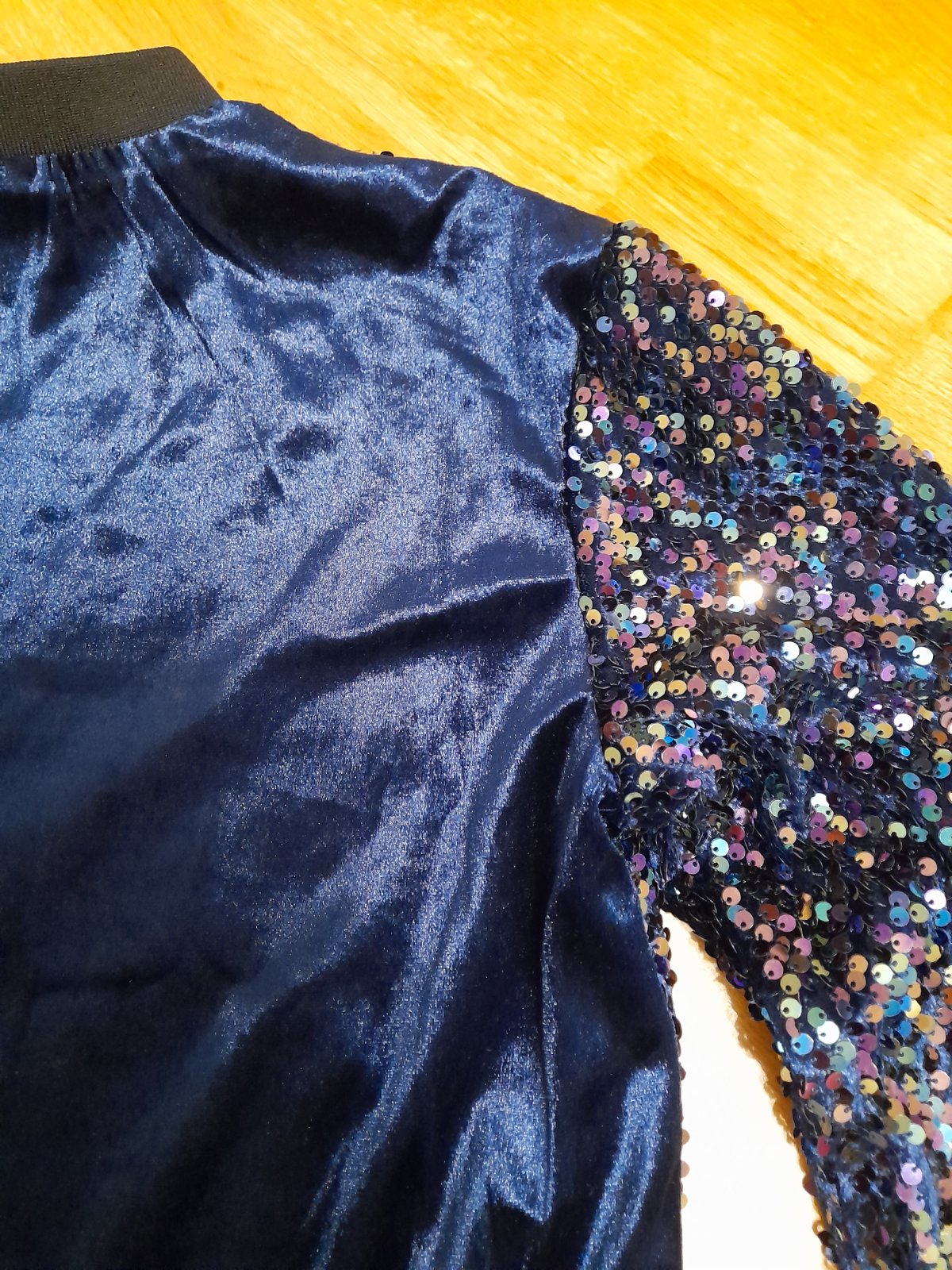 Mikinka veľ. 170 z C&A použitá raz na speváckej súťaži. Predný diel a rukávy flitrové, chrbát sametový. Nech sa páči rozmery: dĺžka od pliecka po spodok je 54 cm, šírka pod pazuškami merané 49 cm, rukáv od pliecka merané 61 cm, od podpazušia 47 cm. Mikinka neškriabe, je komplet podšitá.