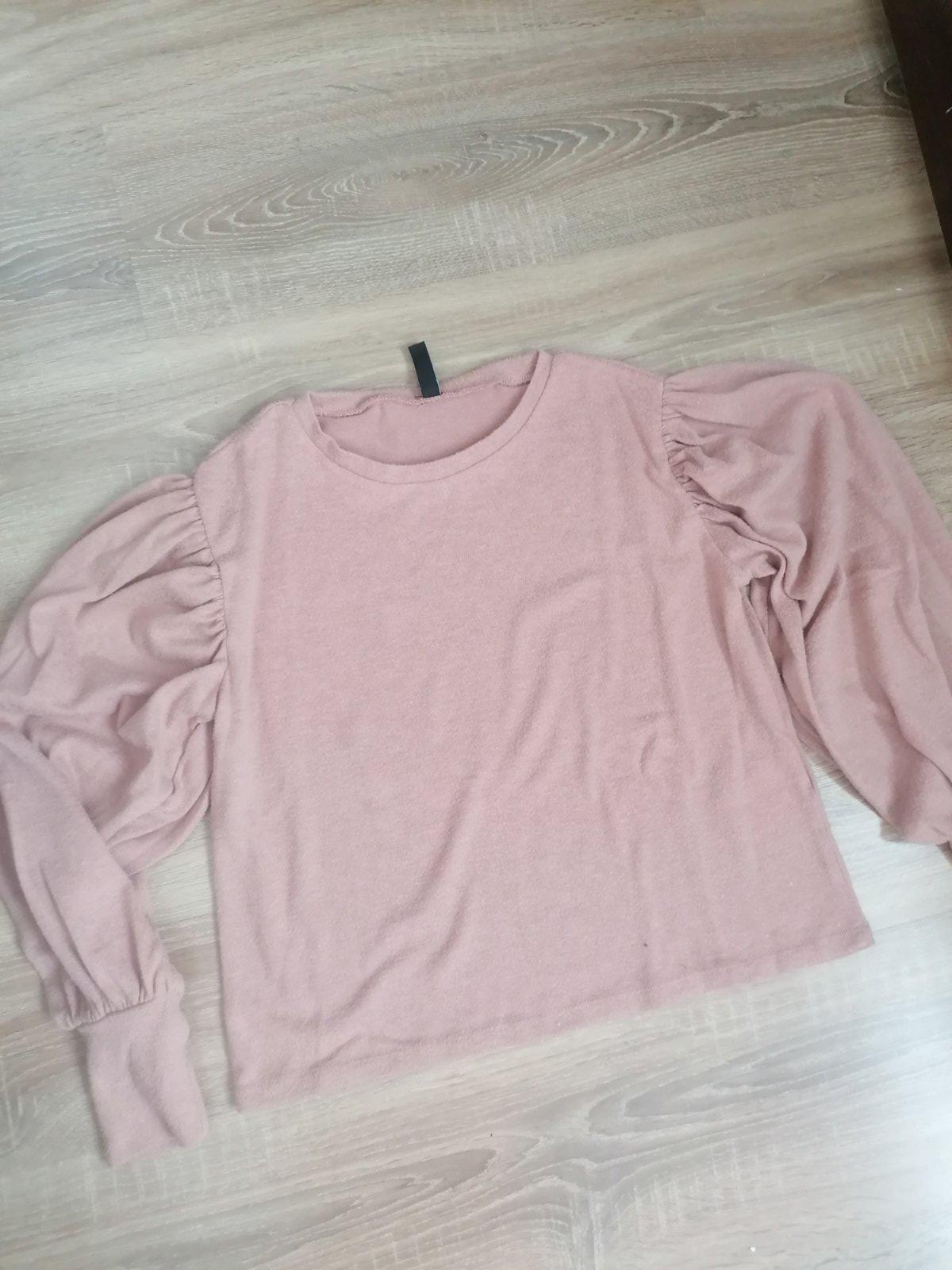 Bleducky svetrík s puff rukávmi, ma zmolky a je taky do pása, čiže kratší. Veľkostne na Mko sadne ako je písané
