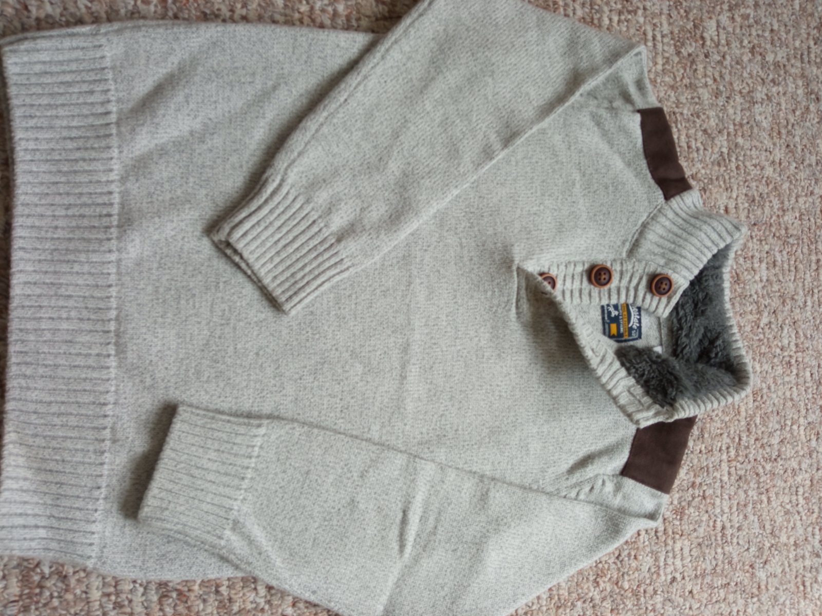 Pulovrik s hnedými vsadkami na pleciach,zateplený okolo krku. V super stave.