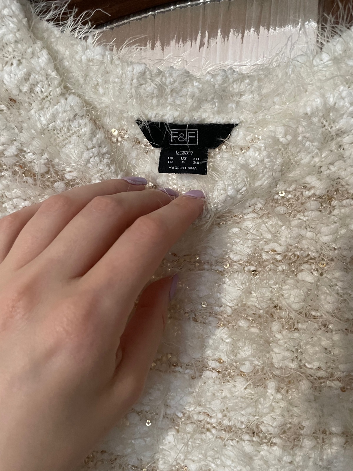 Predám pekný pulóvrik, mäkučký s chĺpkami a flitrami. 2x oblečený, dĺžka 59 cm a šírka prsia 48 cm.