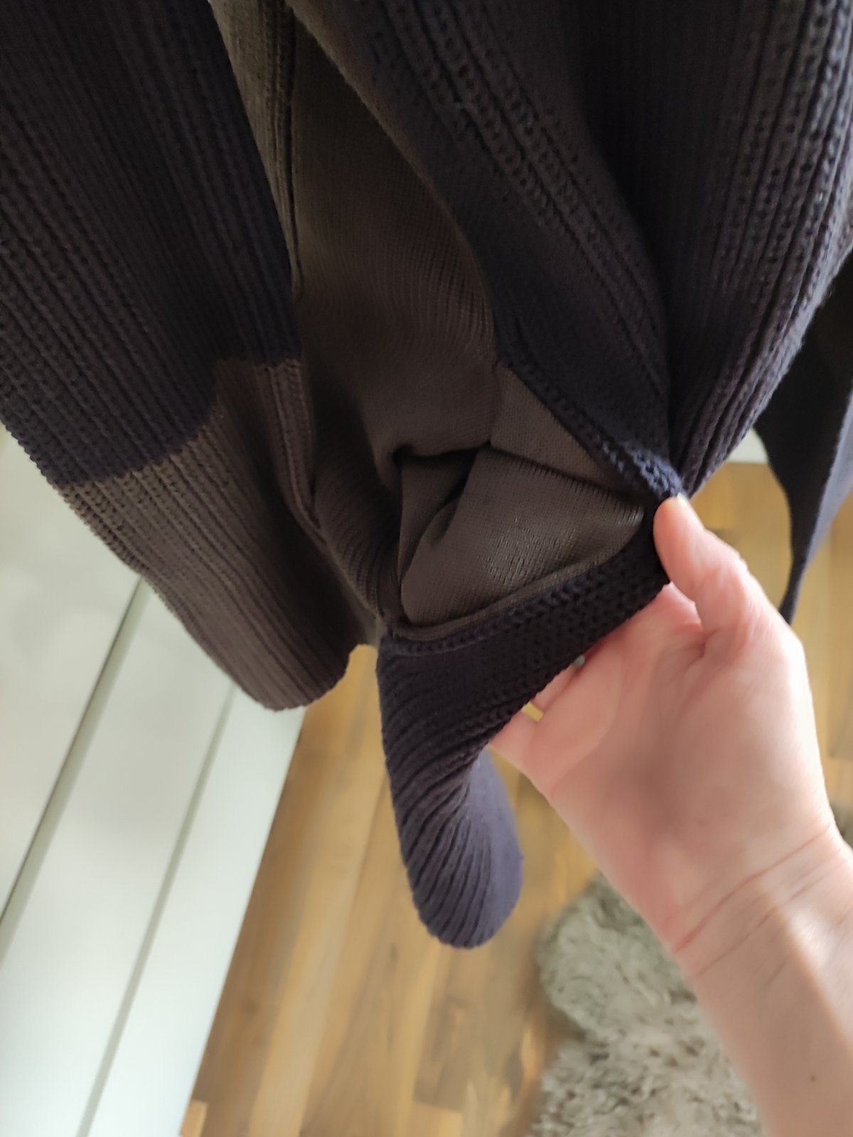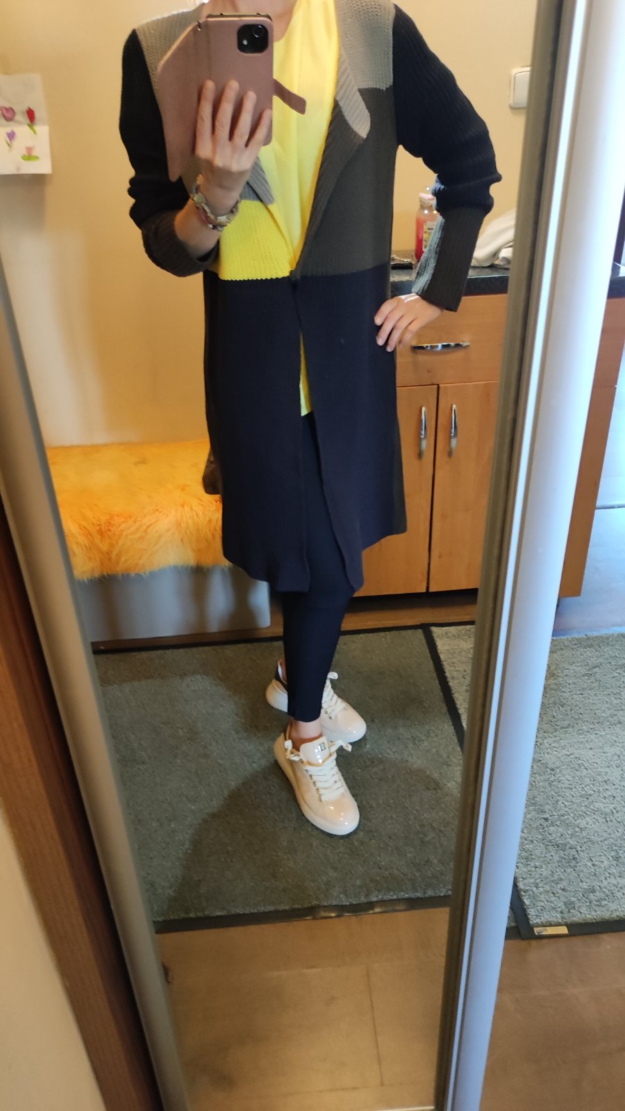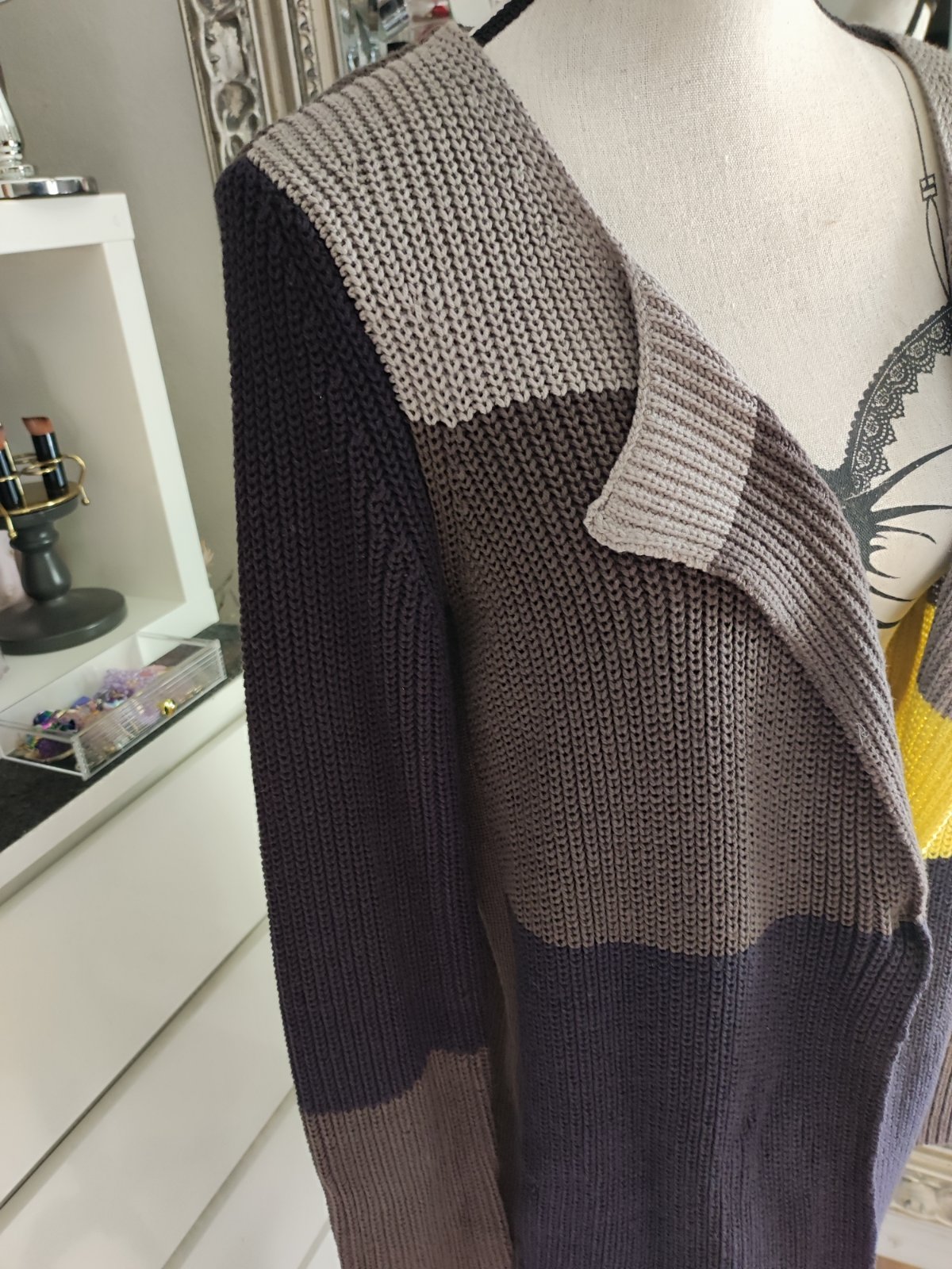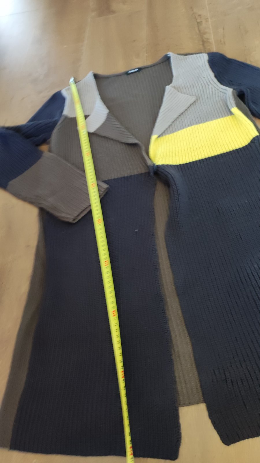 Krásny štýlovy kardigan kombinovaný dvoma látkami. Ma vrecká a patenty. P.c. vysoká 2X oblečený