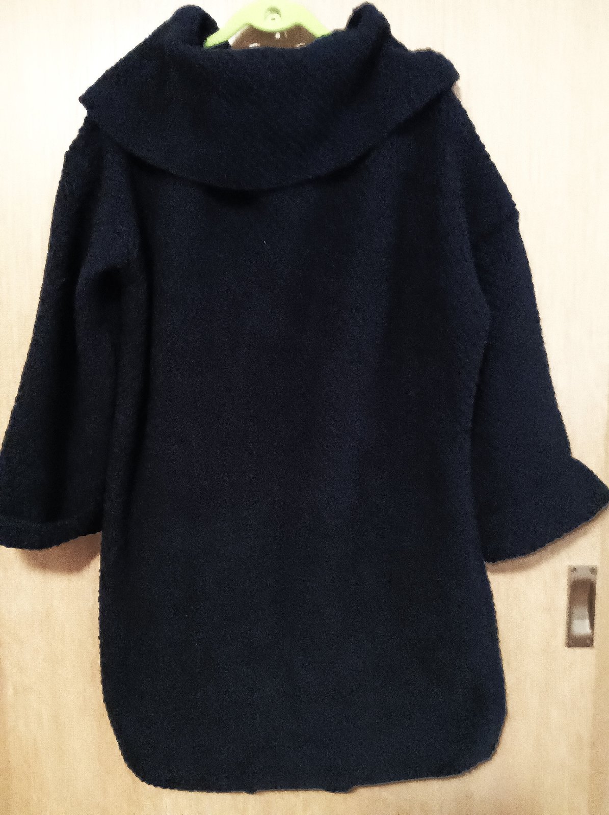 Pekný, variabilný svetrokabátik sýtočiernej farby, na zapínanie s väčším golierom. Veľkosť: XXL - XXXL. Ručne pletený, kúpený od českej handmade zn. Nevyužívam, tak posúvam, raz oblečený. Dĺžka : 100cm, š. pod rukávom: 75cmx2. Pôvodná cena oveľa vyššia.