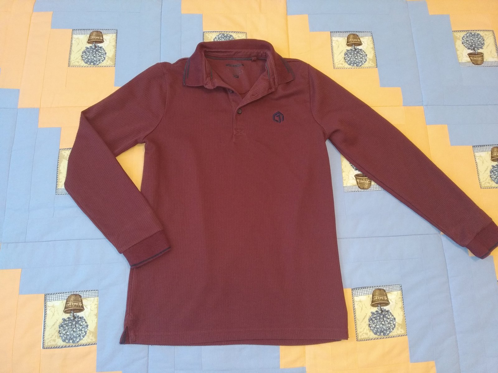 2x pulóver, tmavo bordový Next s golierom (efekt košele), červený Zn.George