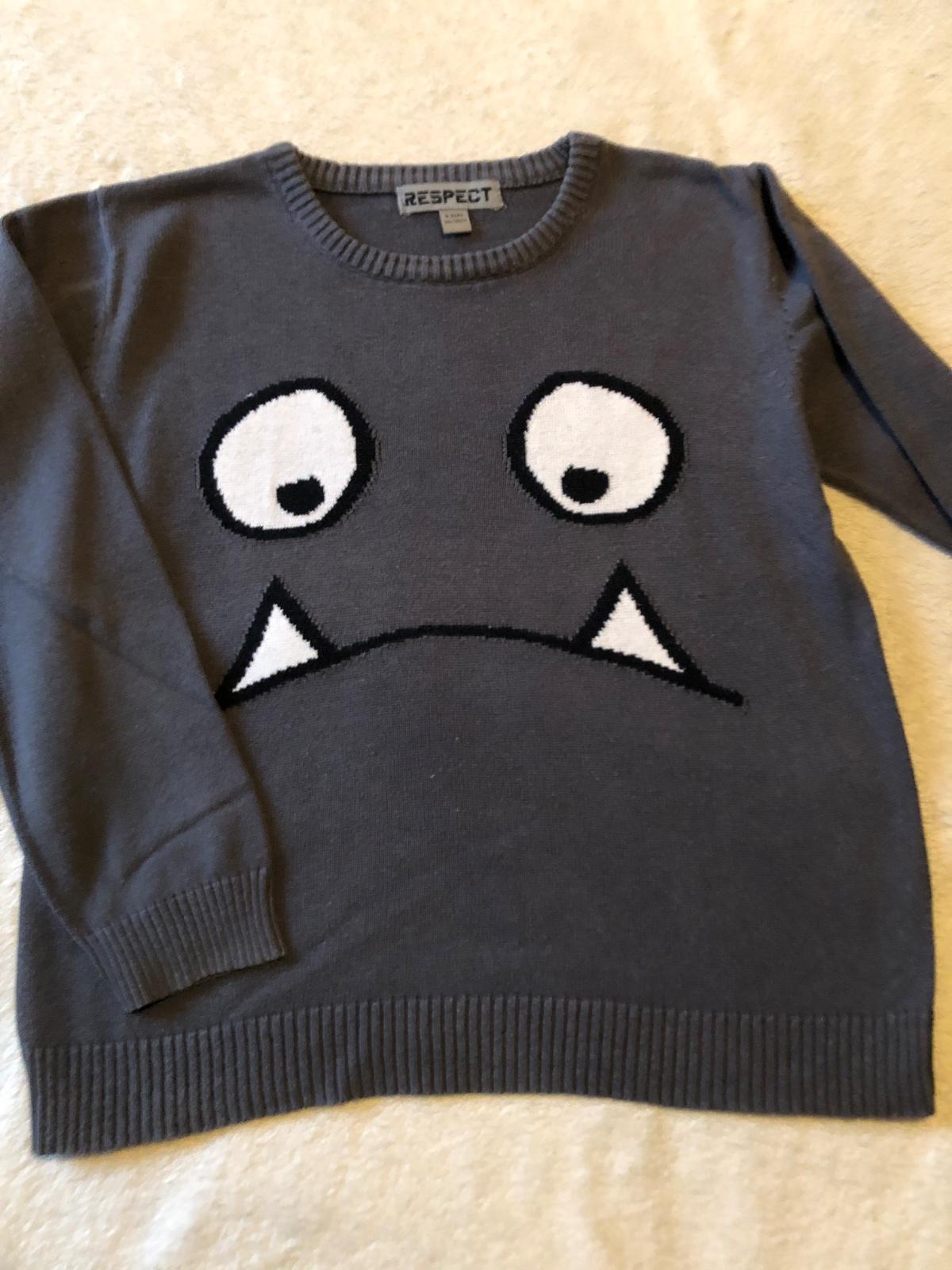 Tmavosedy sveter zn. Respect, velkost 110/116, rozmery na foto. Noseny, bez poskodeni.
