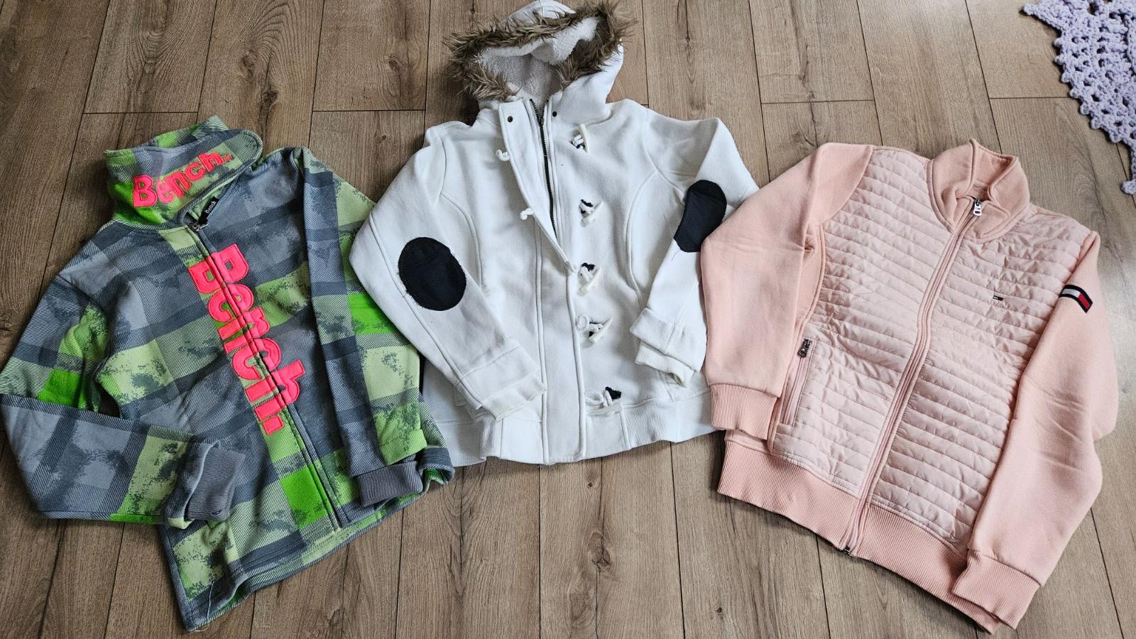 Predám parádne zateplené mikiny, oblečené minimum. Sú v super stave bez poškodení. Sú vhodné aj ako prechodná mikina na jar/jeseň. Biela s kapucňou na štýl "bundy" - zips +zaujímavé gombíky. Ružová má vpredu akoby šuštiak zn. Tommy Hilgiger a šedozelená Bench má vyvýšený golier na suchý zips.