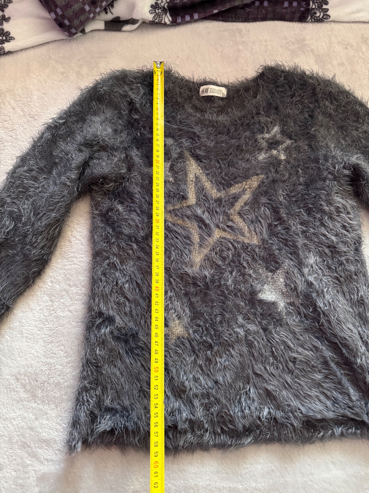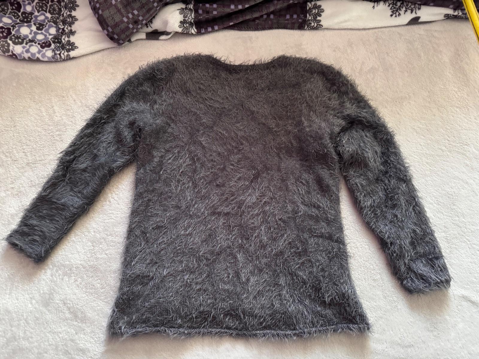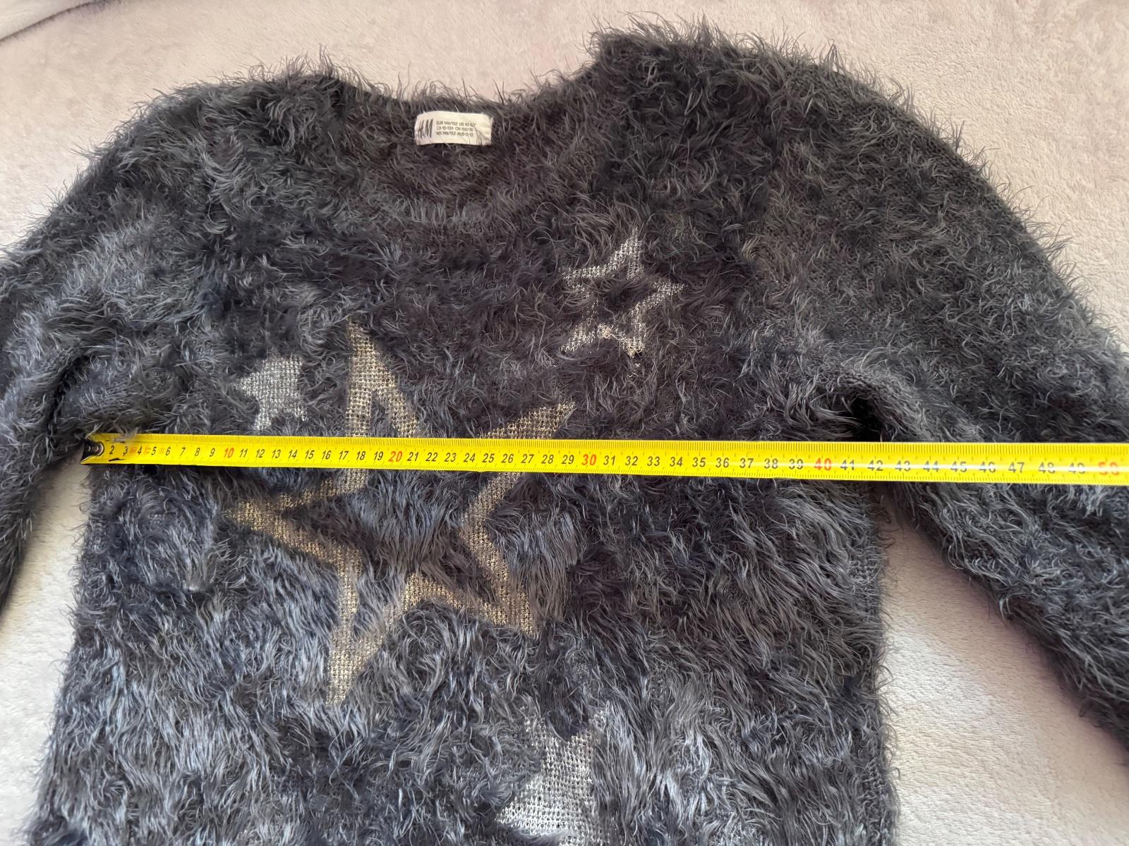 Chlpatý sveter s vyšitými striebornými hviezdami, vo veľmi peknom nosenom stave, poškodenia som nenašla.