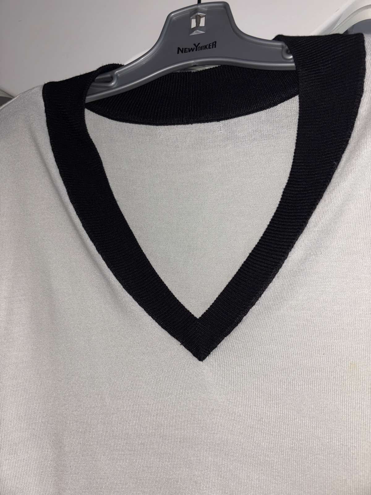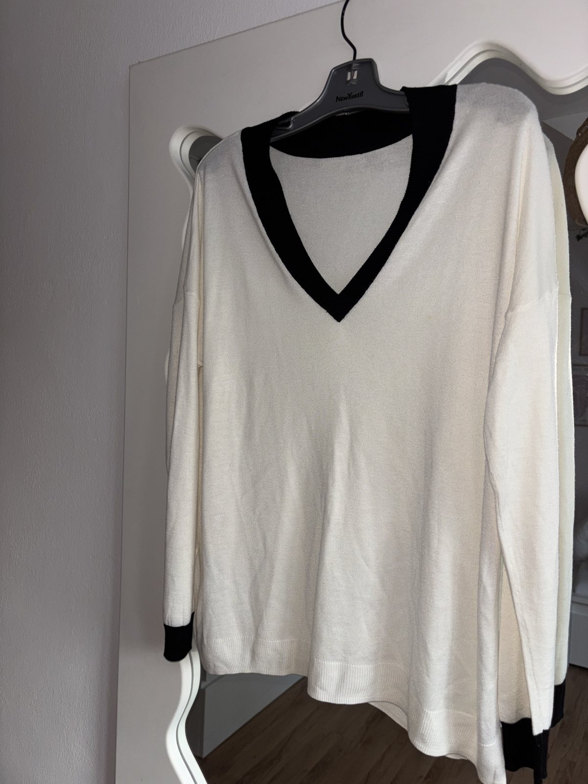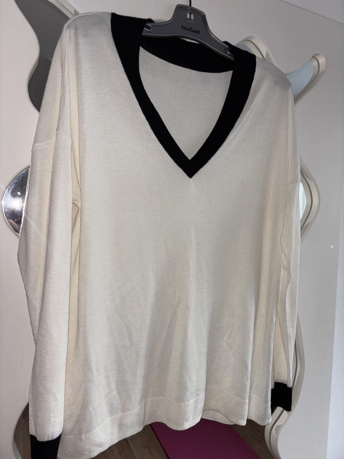 Bez známok nosenia, béžovo-cierny, jemný, odstrihnute štítky, sedí na L, šírka pod pazuchami 63 cm, dĺžka 70 cm