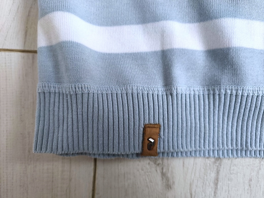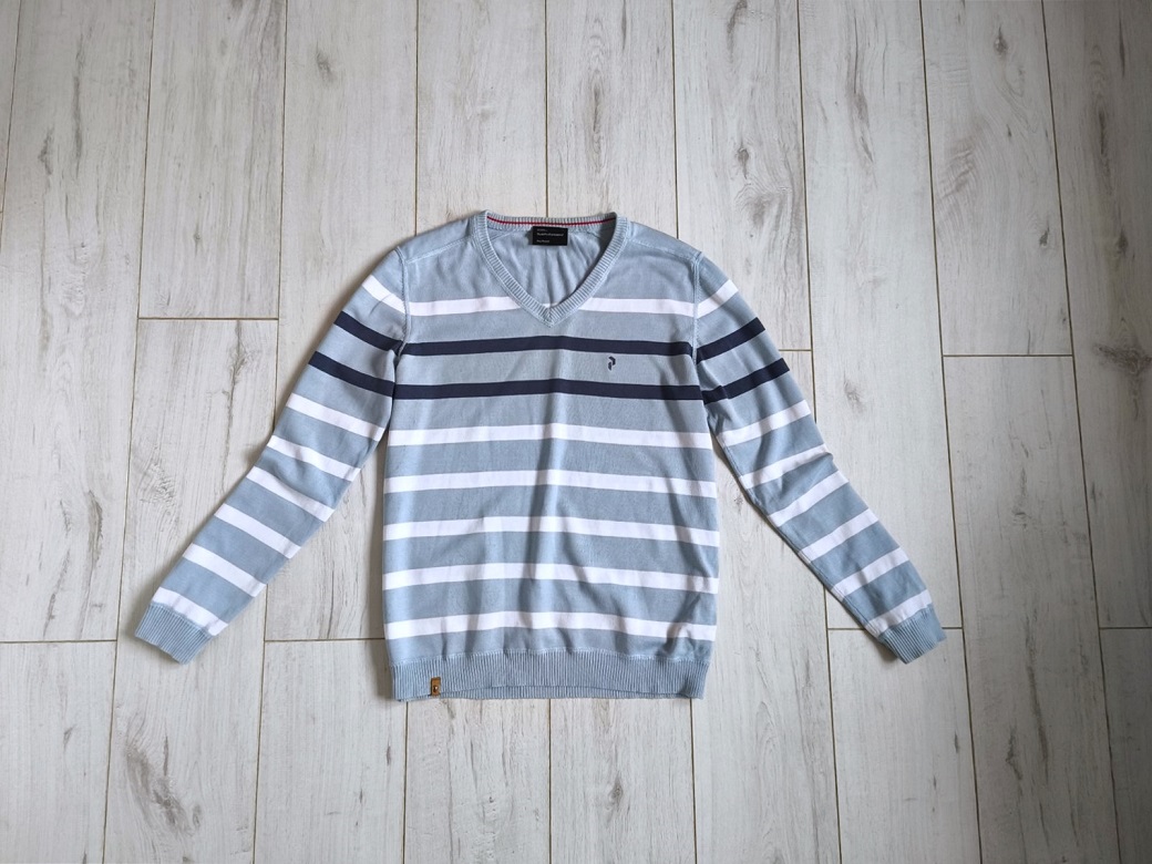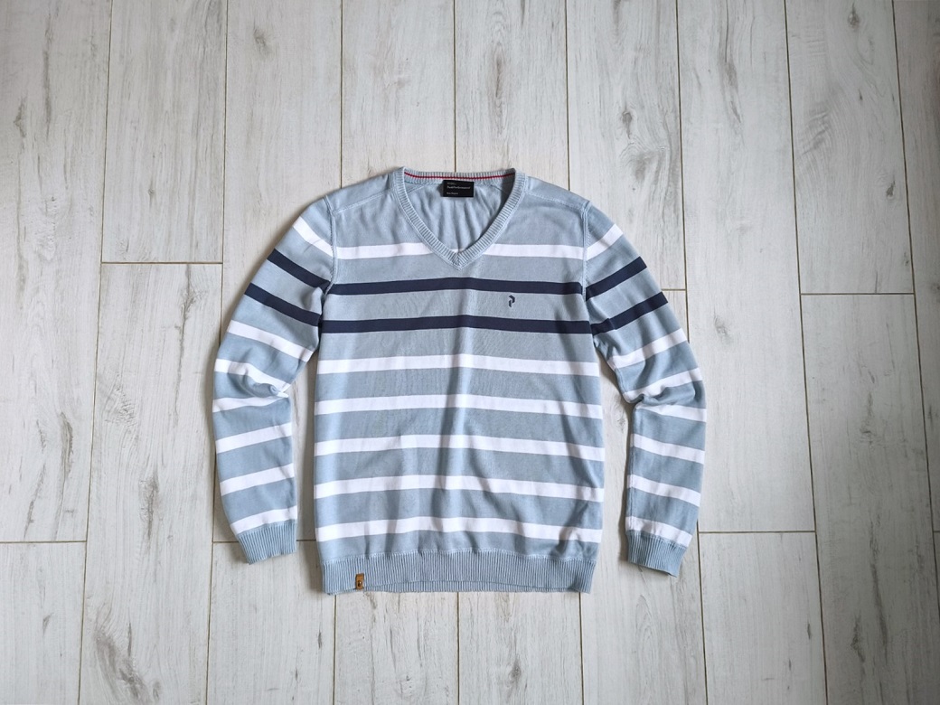 Ponúkam tento pánsky či chlapčenský sveter zn. PEAK PERFORMANCE, prúžkový vo farbách bledomodrá-tmavomodrá-biela, s výstrihom do "V", tenší, ale nie tak že by presvitali, v perfektnom stave ako nový, veľkosť L.