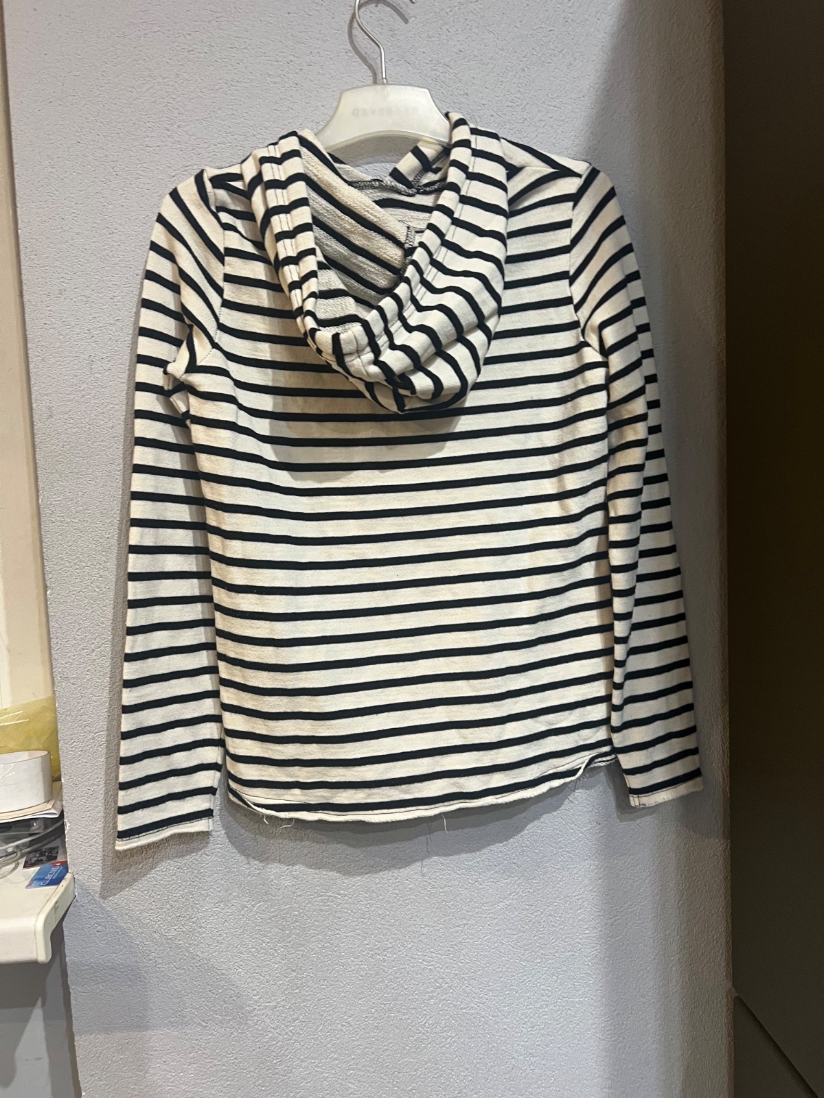 Predĺžená mikina, tunika alebo šaty. Vidieť nosenie na farbe, ale bez konkrétnych poškodení. Trištvrťové rukávy. Golier sa dá nosiť na viacero spôsobov.