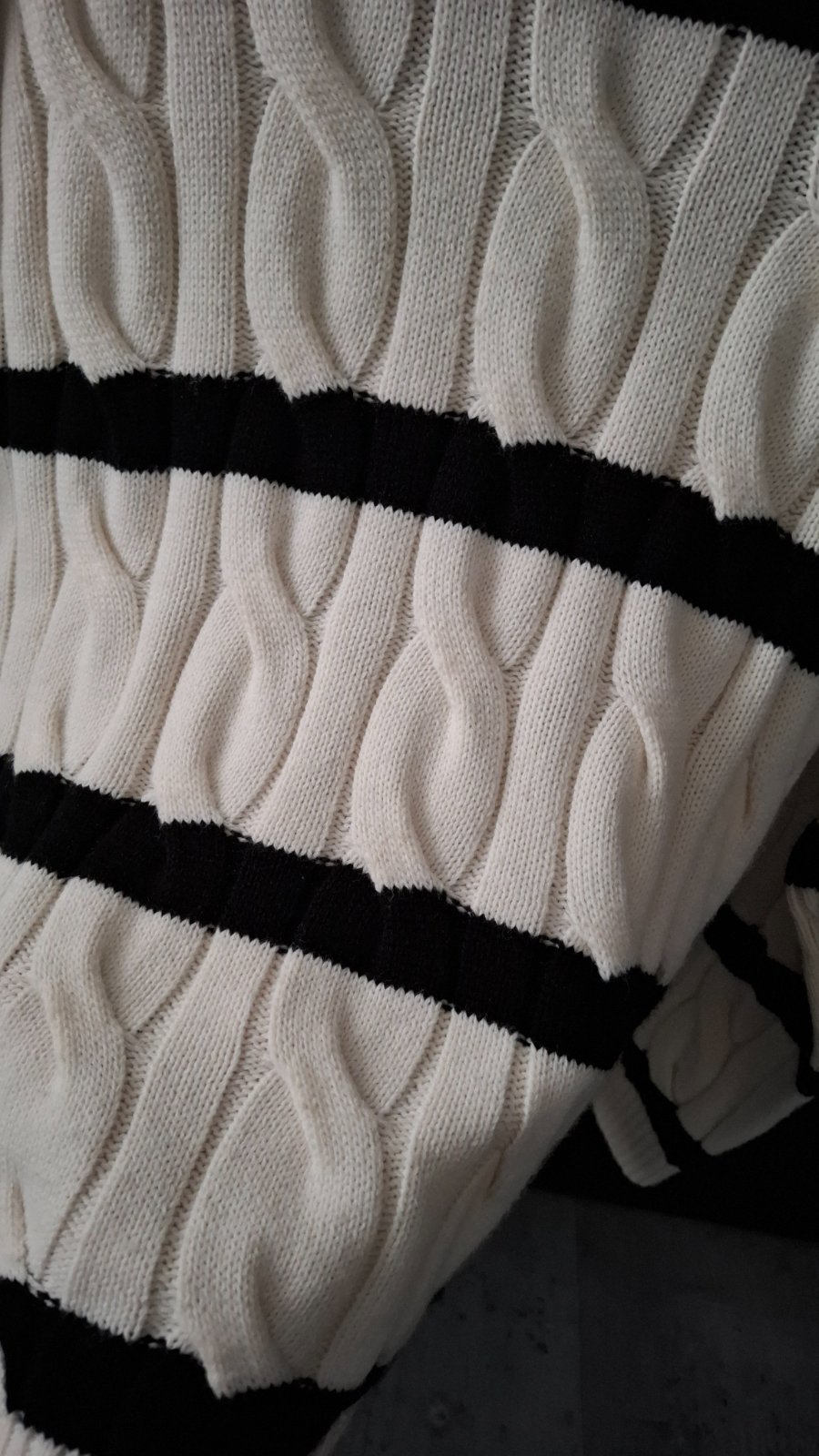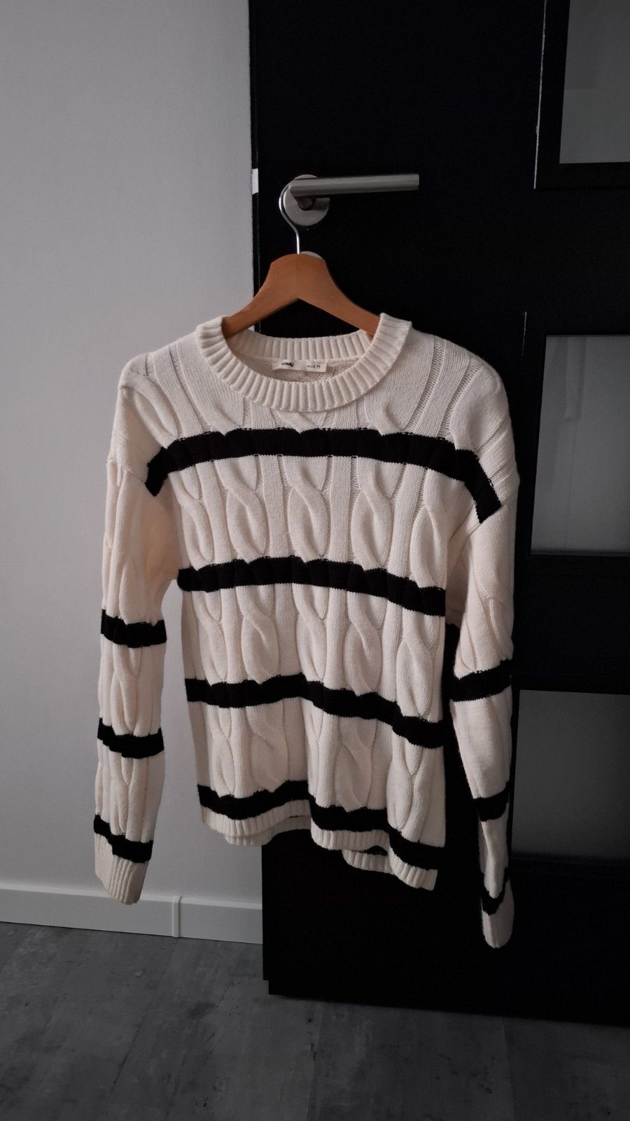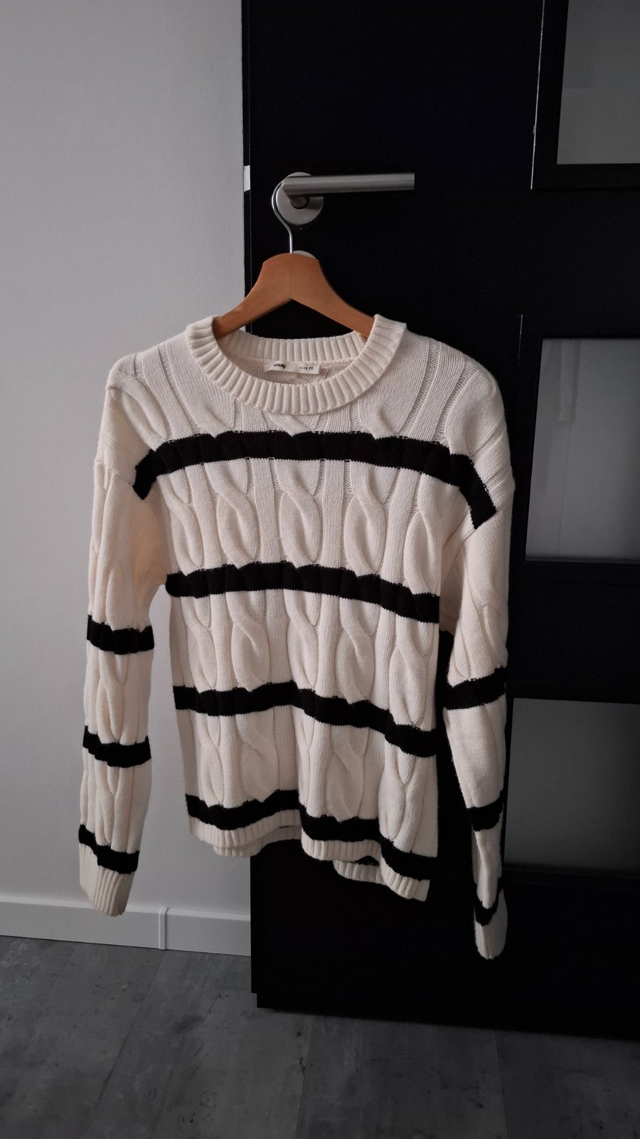 Pletený pulover, over size. Kombinácia bielej, marhuľkovej a orieškovej hnedej. Veľkosť uvedená L ale dobre sedí na M. Ukončené do patentov, okrúhly výstrih okolo krku. Na bežné nosenie. Bez poškod...