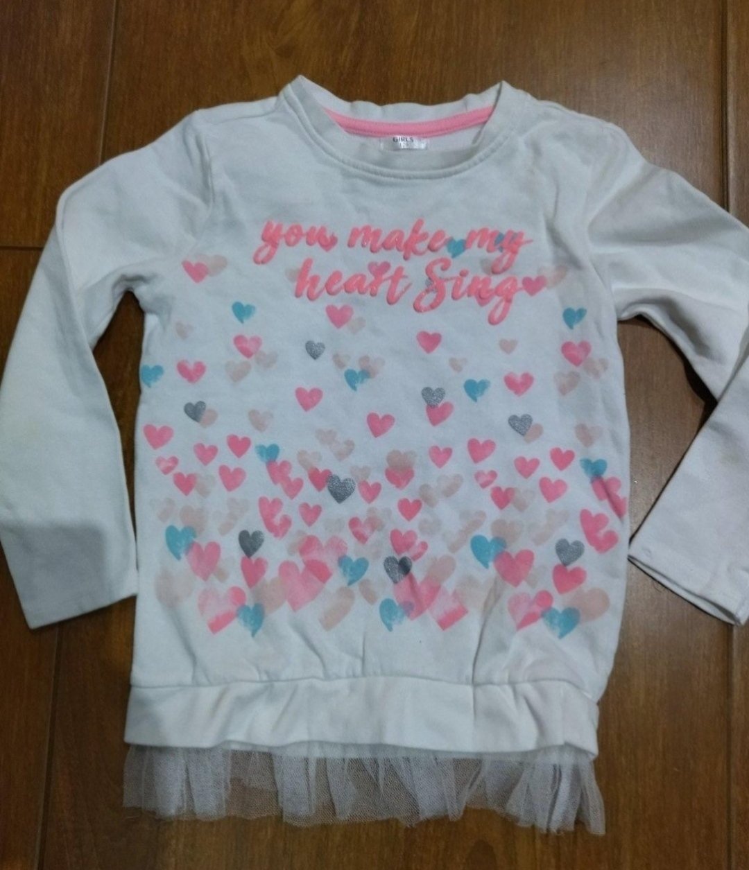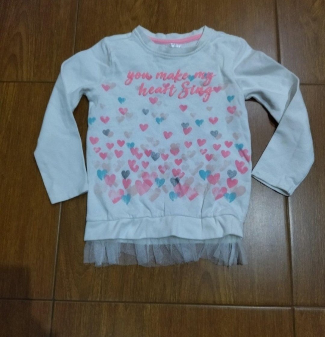 Veľkosť 134, ale je menšia, sedí na 128, kľudne aj na 122/128. Je krátka,tzv.crop mikina. Mám aj pre staršiu sestričku vo veľkosti cca 152