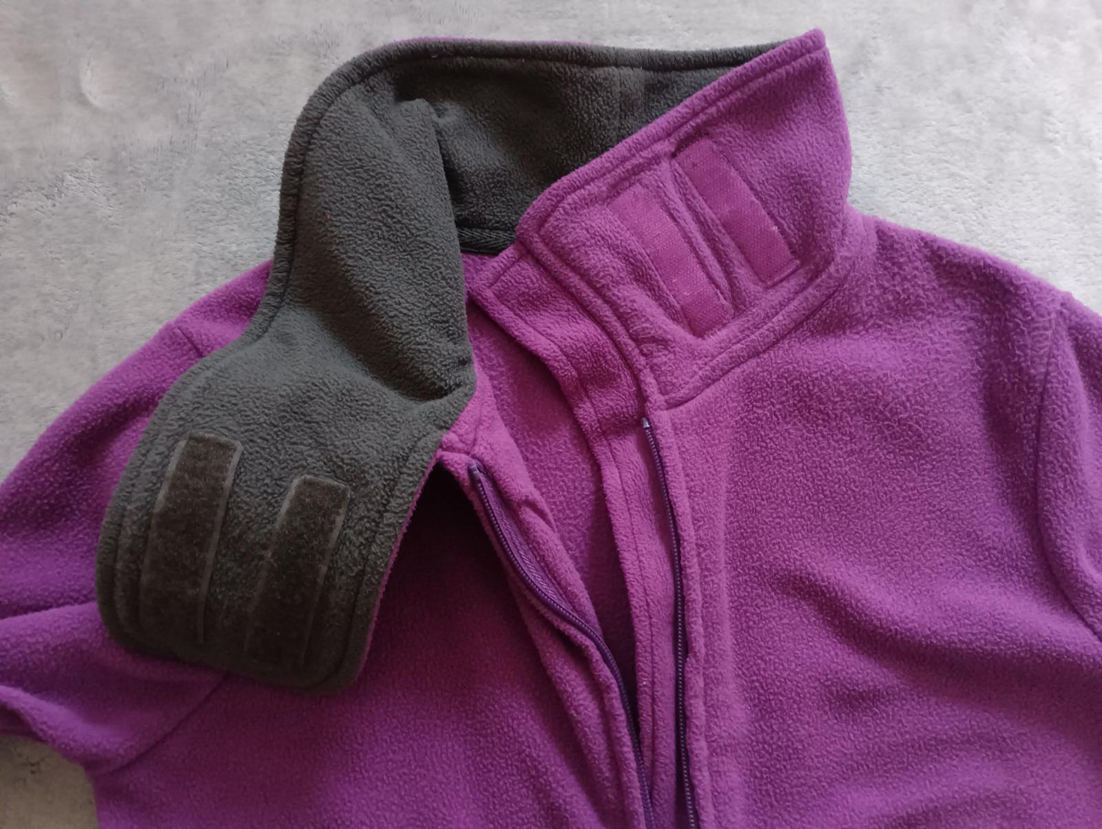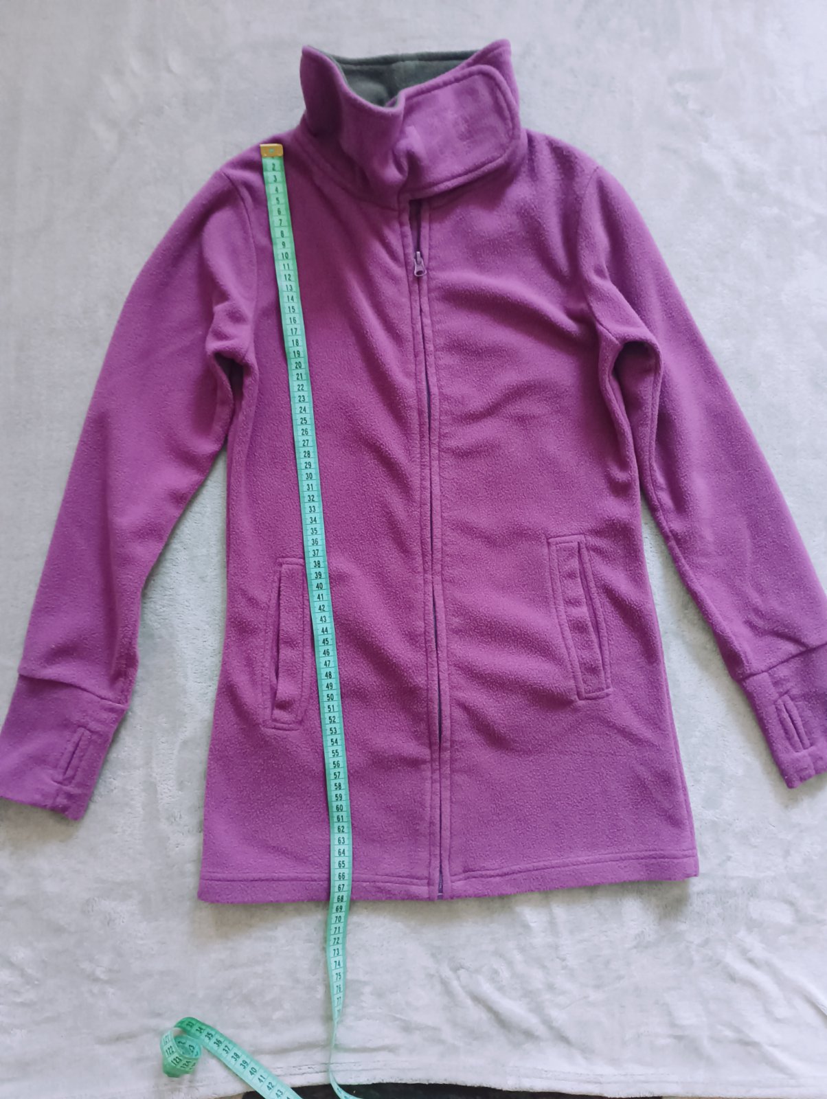 Dlhšia flíšová mikina so stojačikovým golierom. Siaha po bedrá.