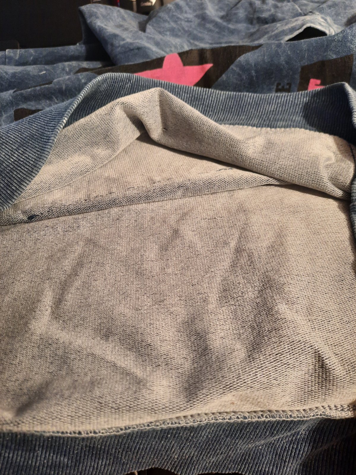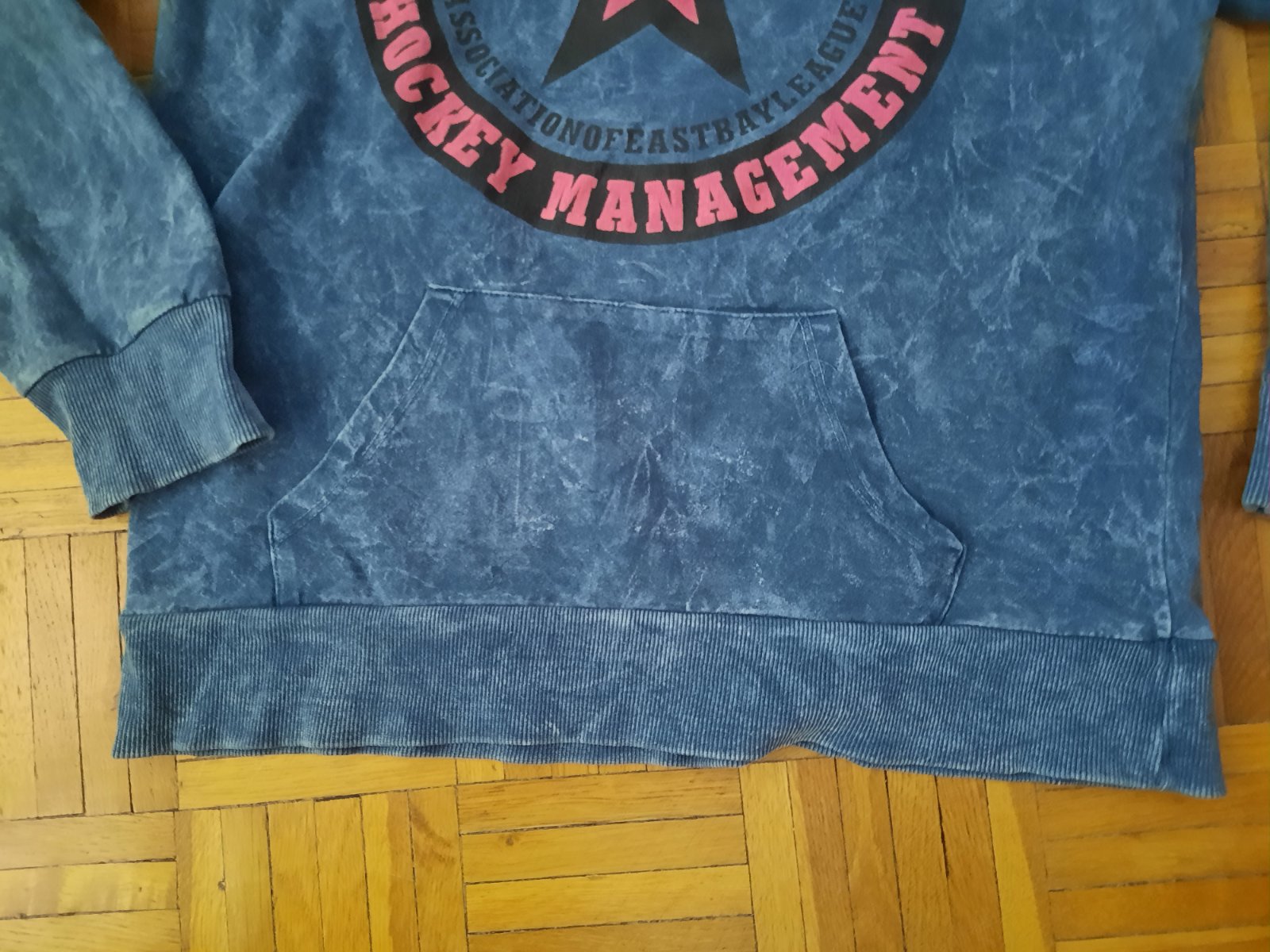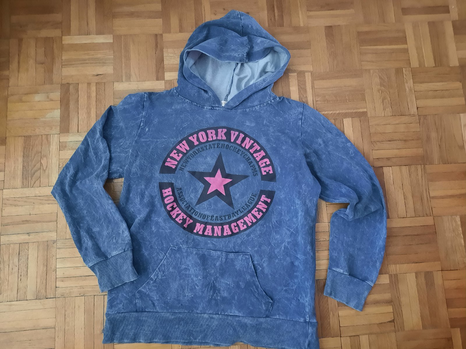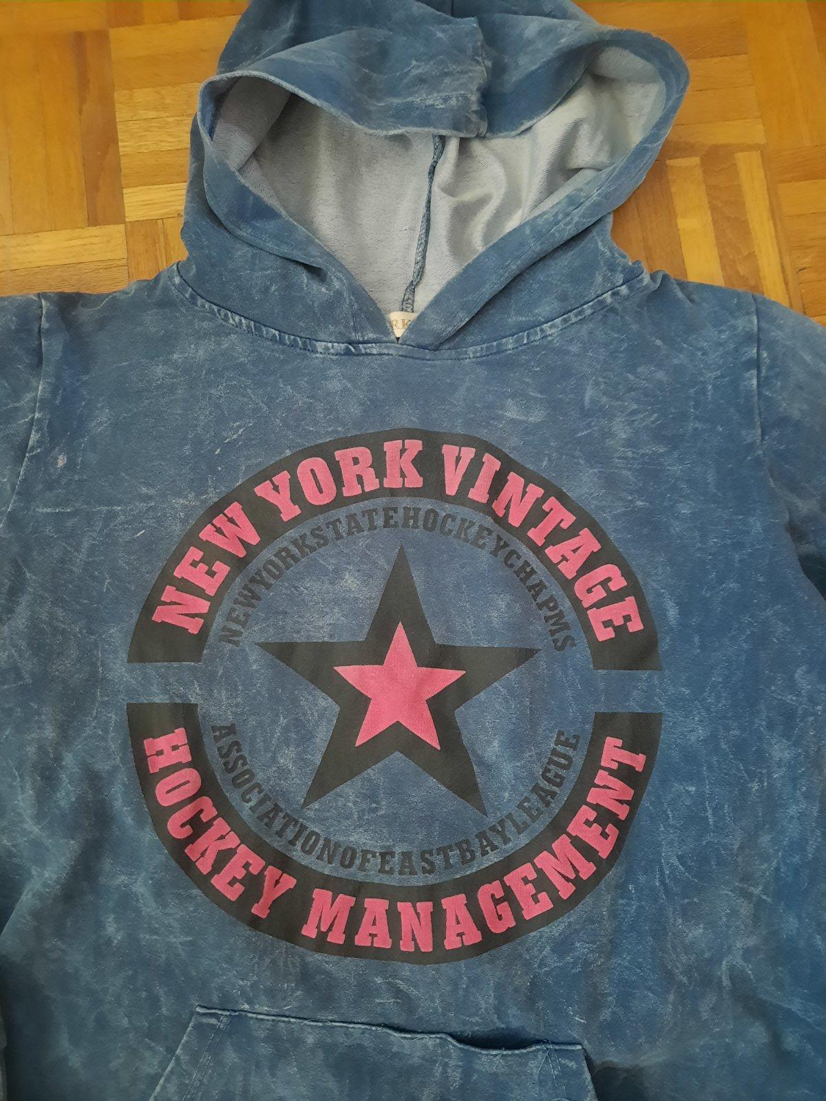 Pekná modrá mikina s kapucňou v kombinácii s ružovou. Má klokanie vačky. Bez poškodenia.